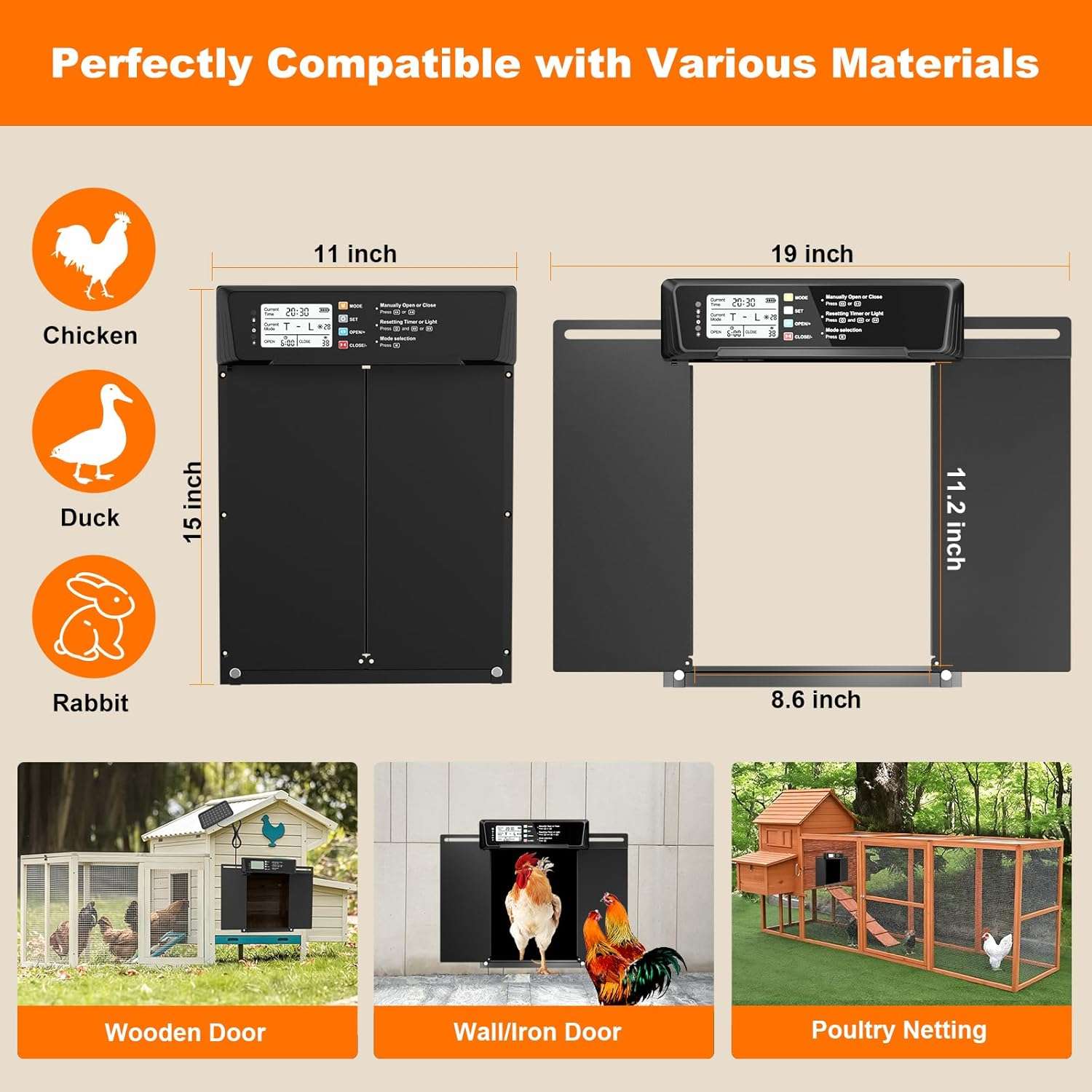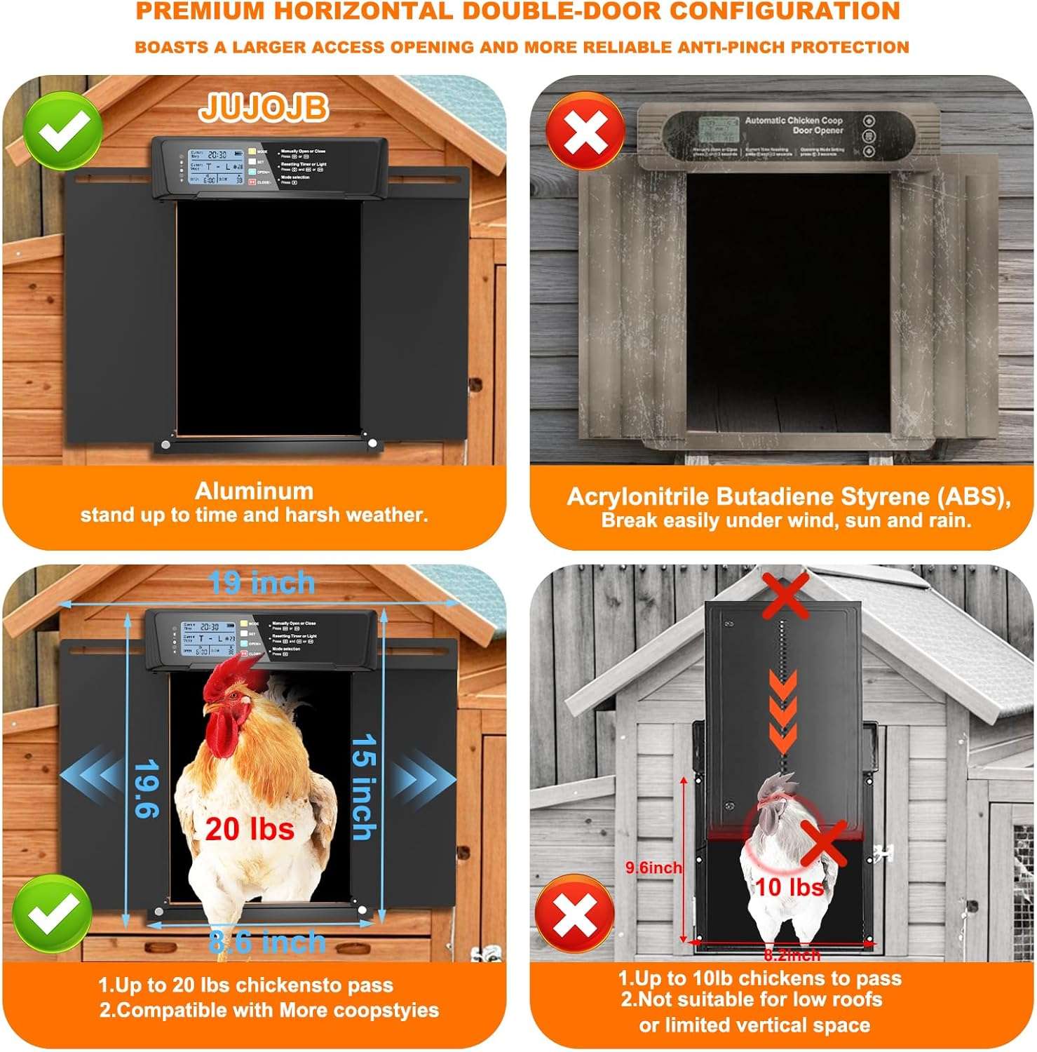 Apertura más ancha: Con 29.5 cm de ancho por 22 cm de alto, permite el paso cómodo de patos y gallinas de razas grandes que no caben en puertas estándar.