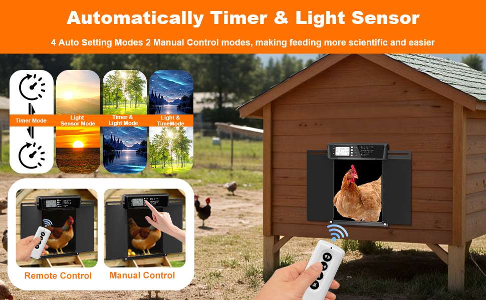 Tecnología de Seguridad Anti-Atrapamiento El sistema cuenta con un sensor de alta sensibilidad. Si la puerta detecta una gallina o un obstáculo mientras se está cerrando, se detendrá inmediatamente y se abrirá de nuevo para evitar daños, garantizando un funcionamiento libre de lesiones.