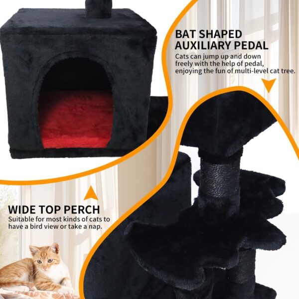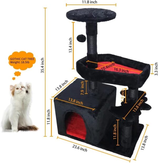 Diseño innovador: añade muchos elementos góticos, como pedal auxiliar en forma de murciélago, cama de gato ataúd, plataforma de tela de araña. La combinación de negro y rojo hace un color misterioso, perfecta integración de moda y funcionalidad, creando muebles góticos peculiares y de moda para gatos.
