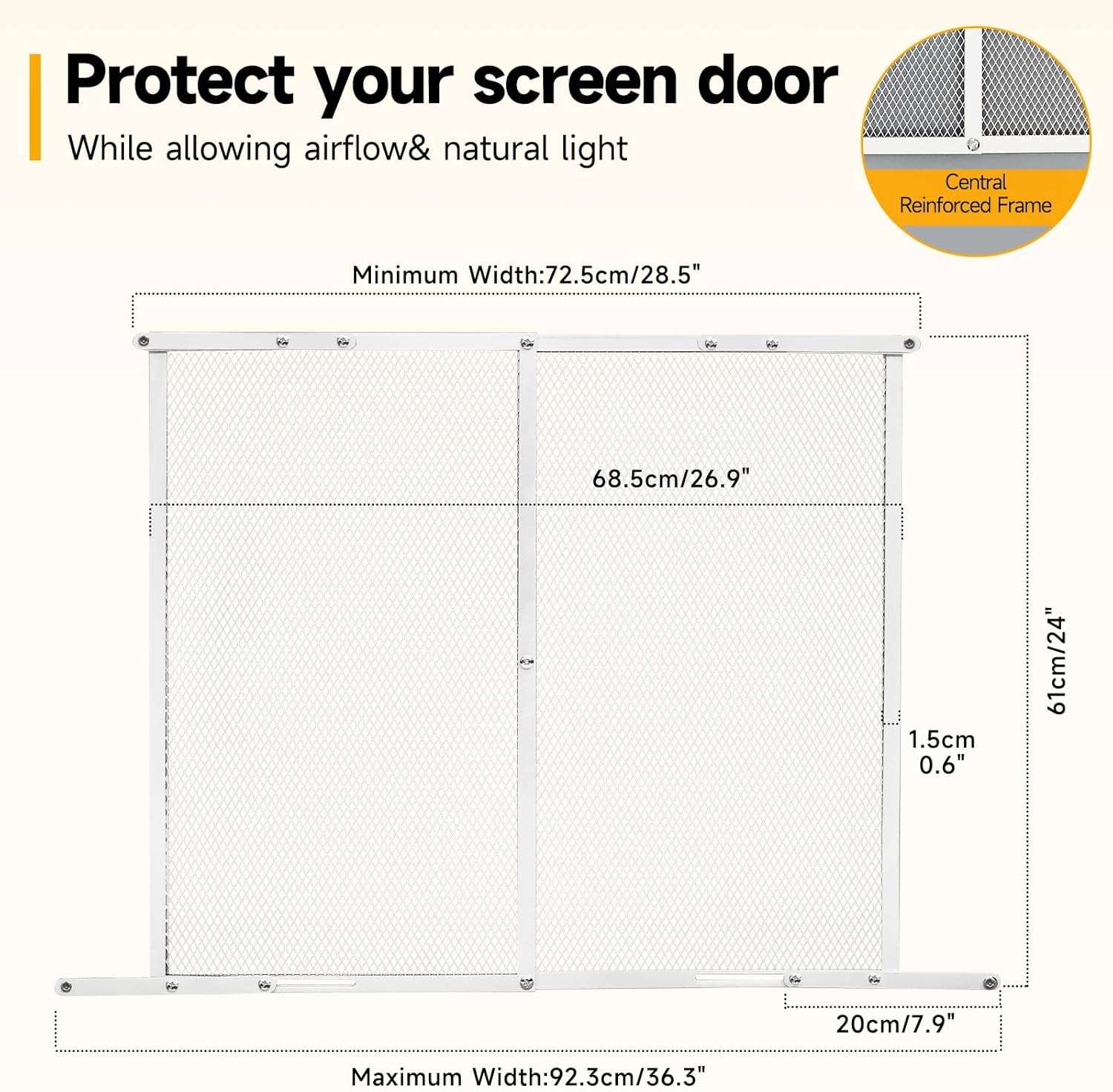 Aluminio Ultra Resistente y Mayor Altura Olvidate de los gastos en reparaciones de mallas rotas. Fabricada en una aleacion de aluminio con un acabado de pintura horneada, esta rejilla destaca por sus imponentes 61 centimetros de alto. Su estructura es tan firme que soportara los saltos de perros grandes sin doblarse. Si tu companero es de contextura fuerte y mide unos 36 centimetros de alto por 55 centimetros de largo, esta barrera contendra su peso y rasgunos manteniendo tu puerta intacta.