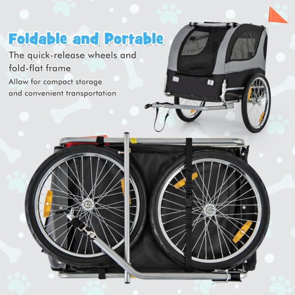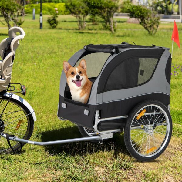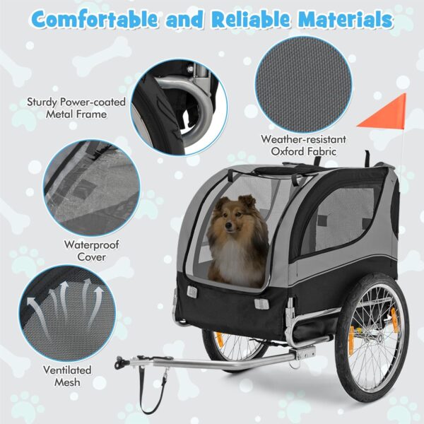 Material de primera calidad y fácil almacenamiento: este remolque para mascotas está hecho de acero inoxidable y tela Oxford resistente al desgaste, que es resistente y duradera para garantizar una vida útil más larga. Además, el remolque de bicicleta es fácil de montar y se puede plegar para un almacenamiento y transporte convenientes.