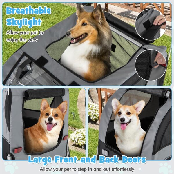 Buena ventilación y fácil acceso: el remolque para mascotas tiene puertas de malla con cremallera en la parte delantera, trasera y superior. Todas las puertas se pueden enrollar con prácticos cierres de gancho y bucle, fácil acceso para tu mascota. La puerta frontal transparente y el diseño de malla lateral permiten que las mascotas disfruten de hermosos paisajes en el camino.