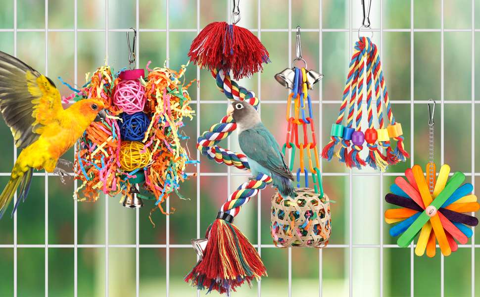 Diseño colorido y atractivo: el juego incluye cinco juguetes masticables vibrantes y coloridos que son visualmente atractivos para loros pequeños y medianos, cacatúas, periquitos, conures, guacamayos, tortolitos, periquitos, periquitos, pinzones, loros, etc. También puedes ocultar sus golosinas en los juguetes para captar su atención y fomentar el juego.