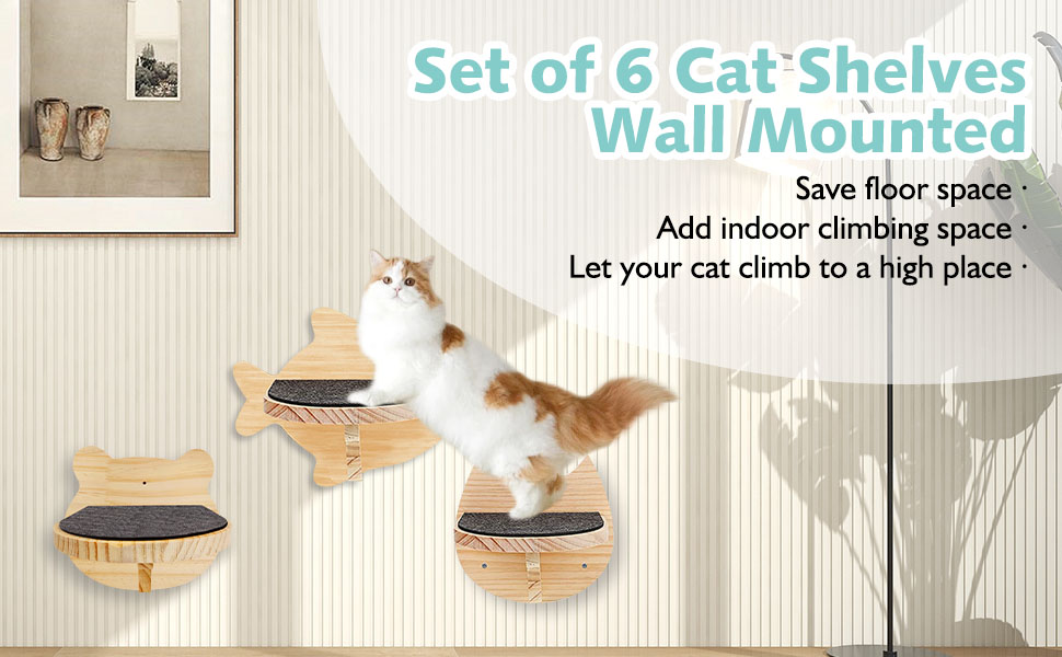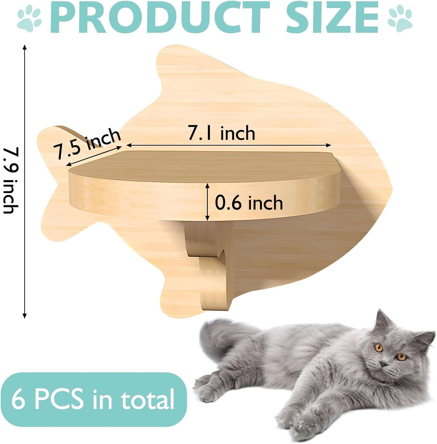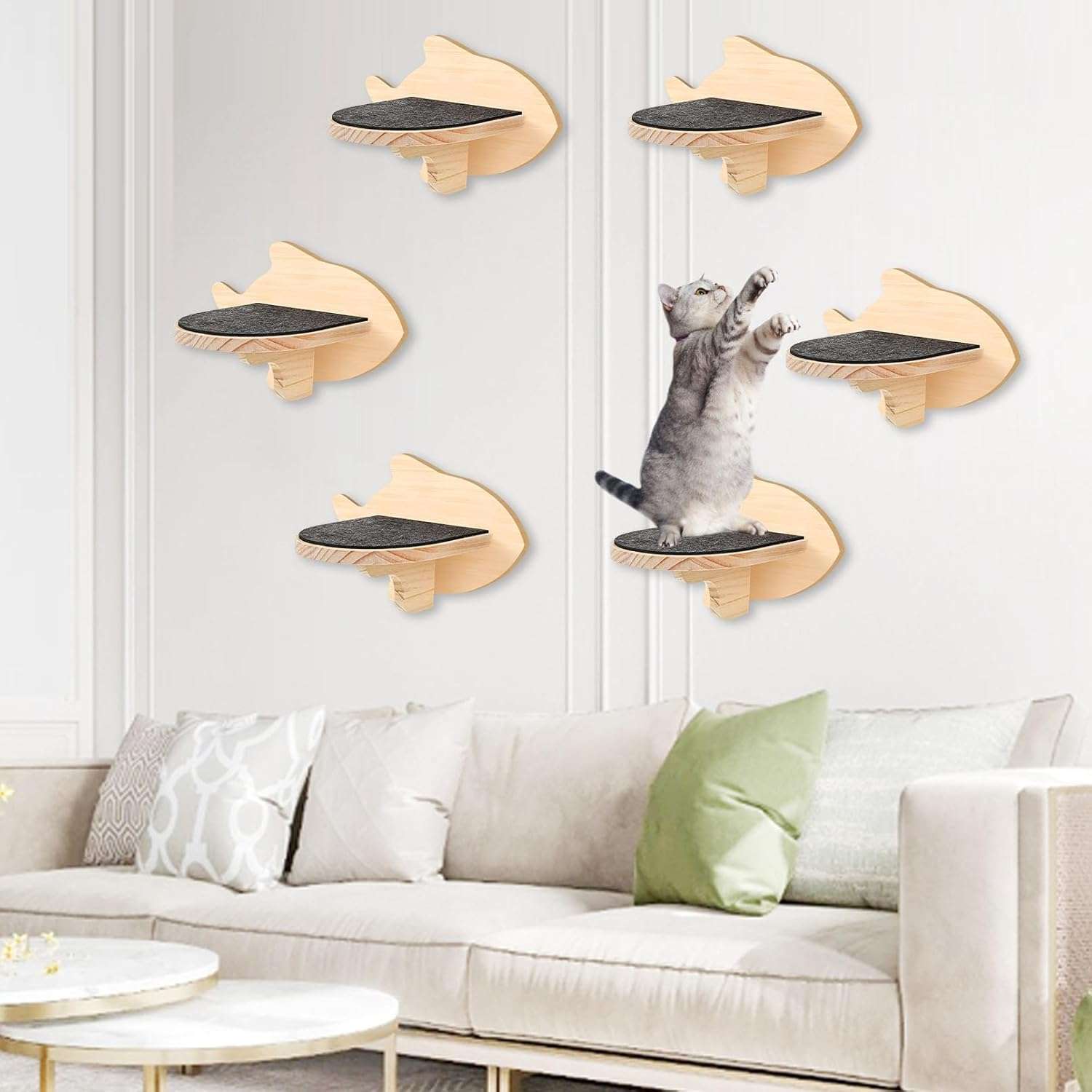 Set de 6 Repisas de Pared para Gatos (19x18x20 cm): Escalones de Madera Forma de Pez.