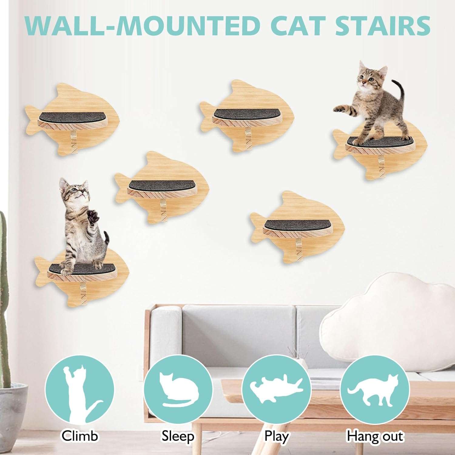 Regale a su gato un regalo practico y divertido. Este set de 6 escalones con diseño de pez transforma cualquier pared en un circuito de aventuras, ideal para que su mascota salte y juegue con seguridad.