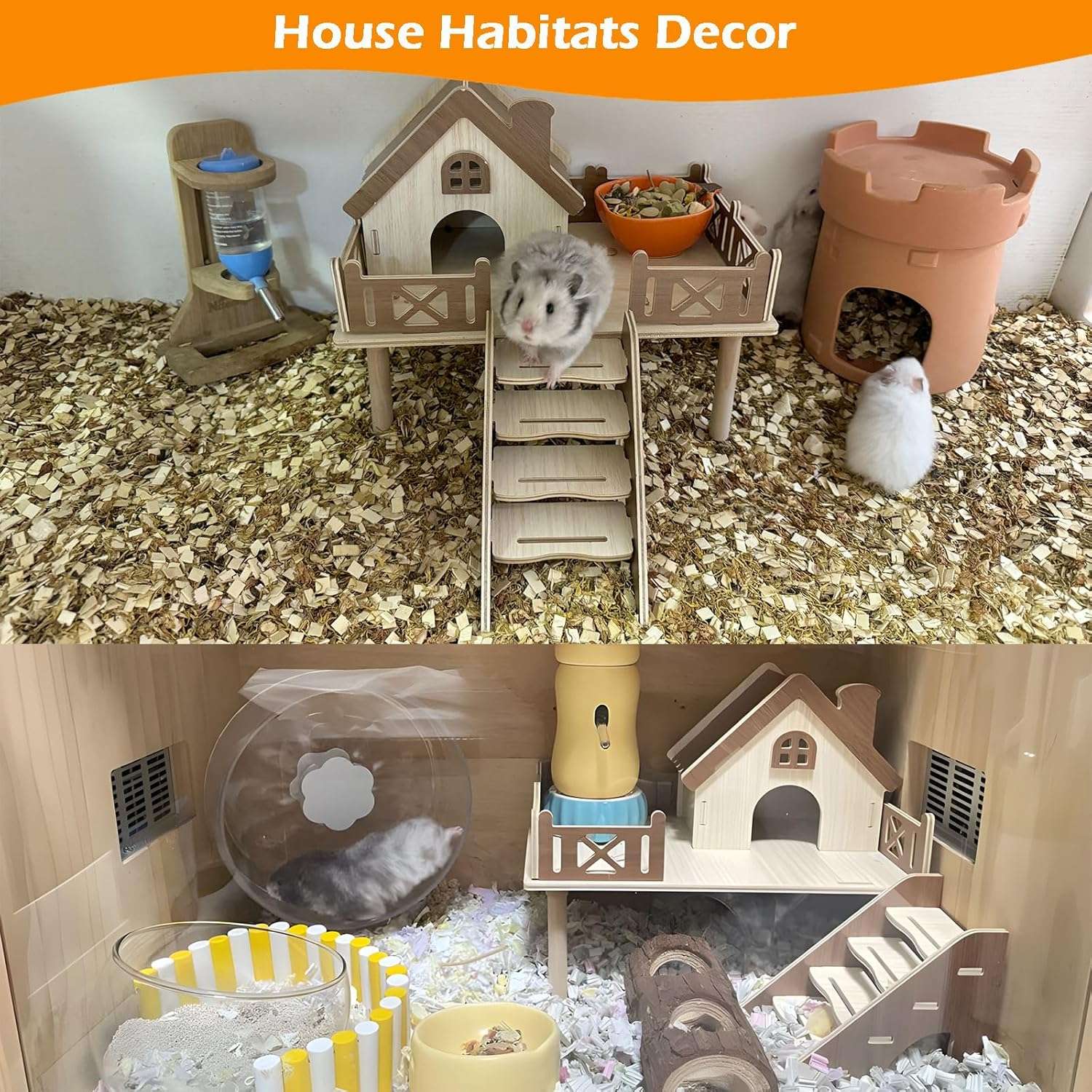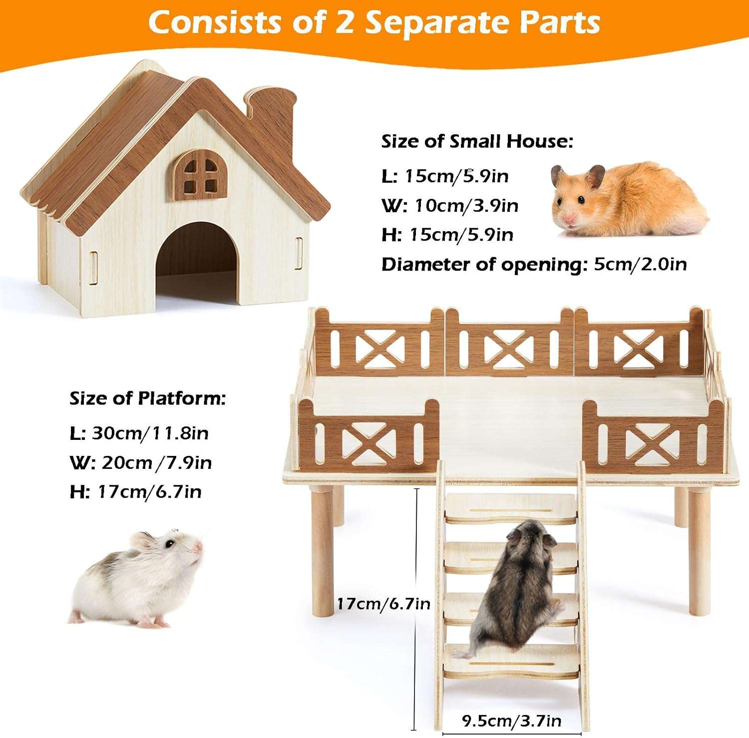Dos partes – Plataforma y cabaña: El paquete contiene una plataforma de madera para hámster y una adorable casa de hámster. La plataforma proporciona una superficie estable y confiable para diversas actividades, mientras que la casa de jerbos ofrece un espacio privado para que los hámsters se relajen