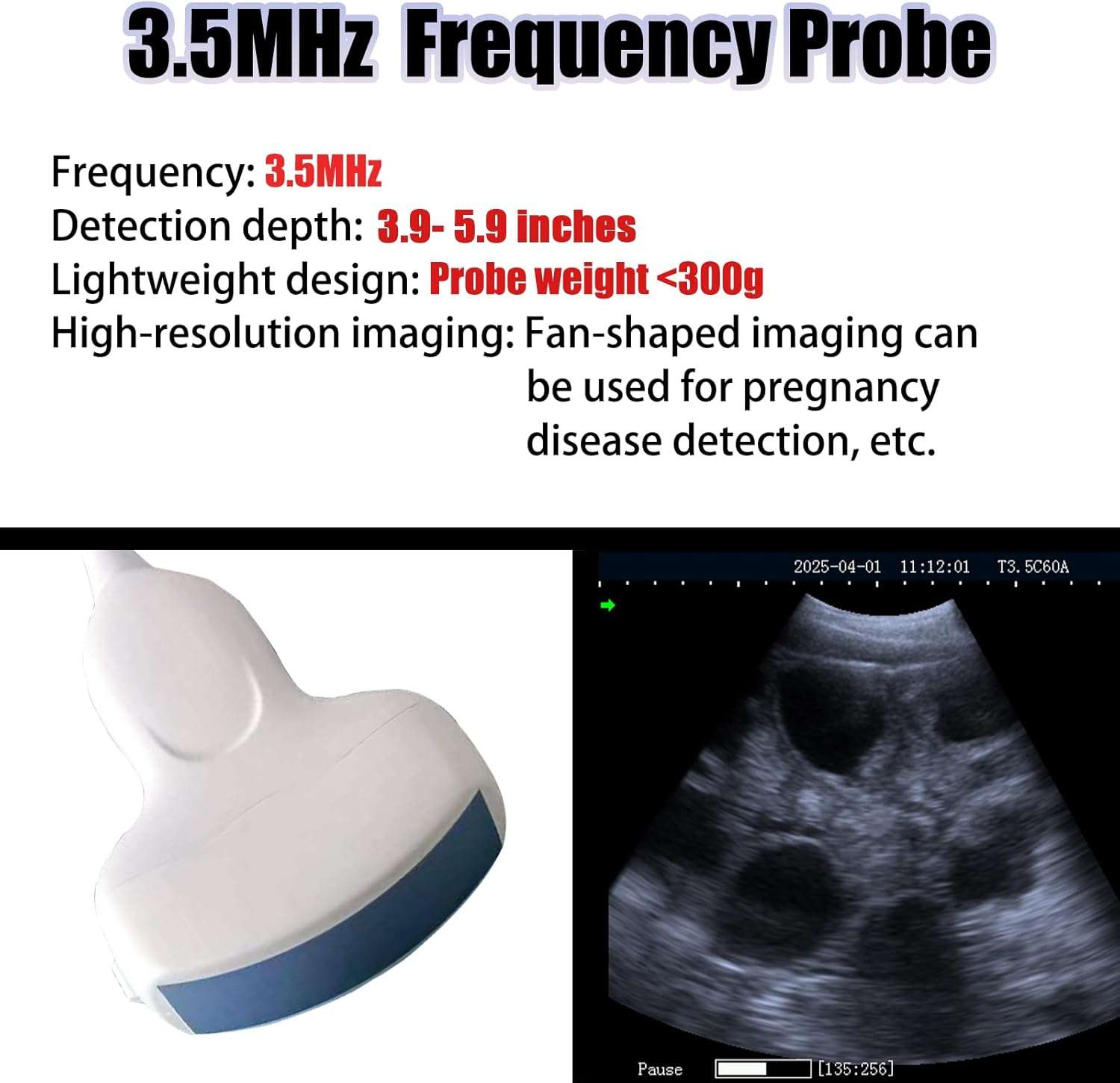 Frecuencia Central: 3.5 MHz (Baja frecuencia / Alta penetración).
