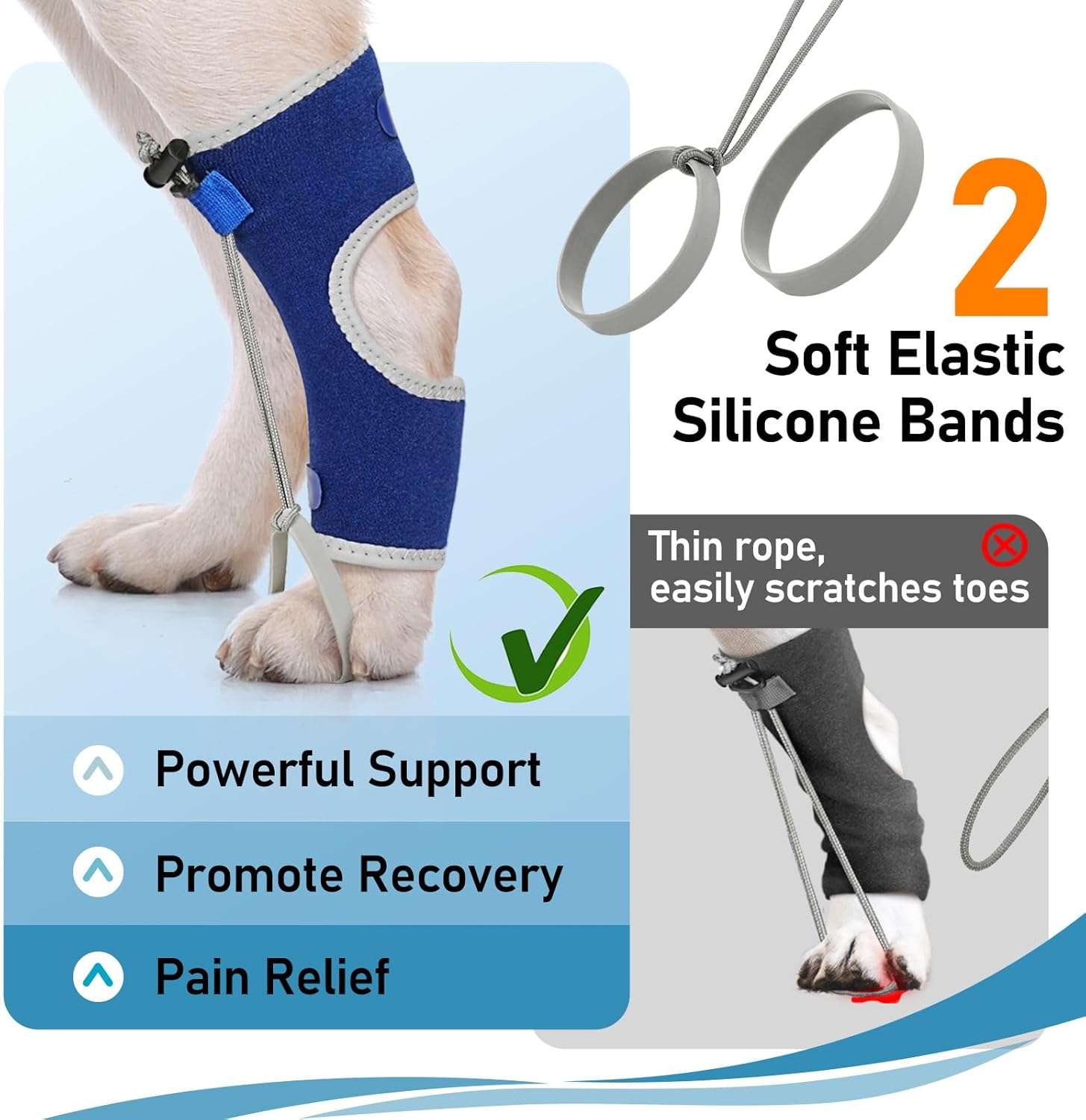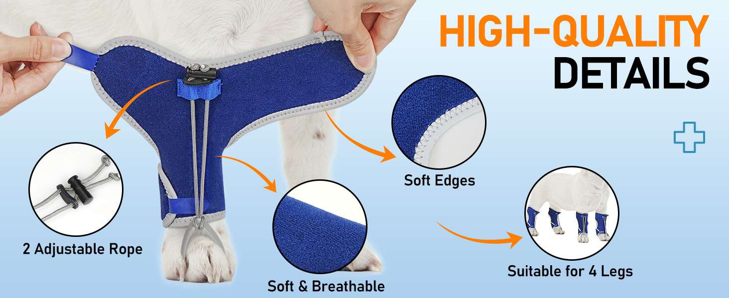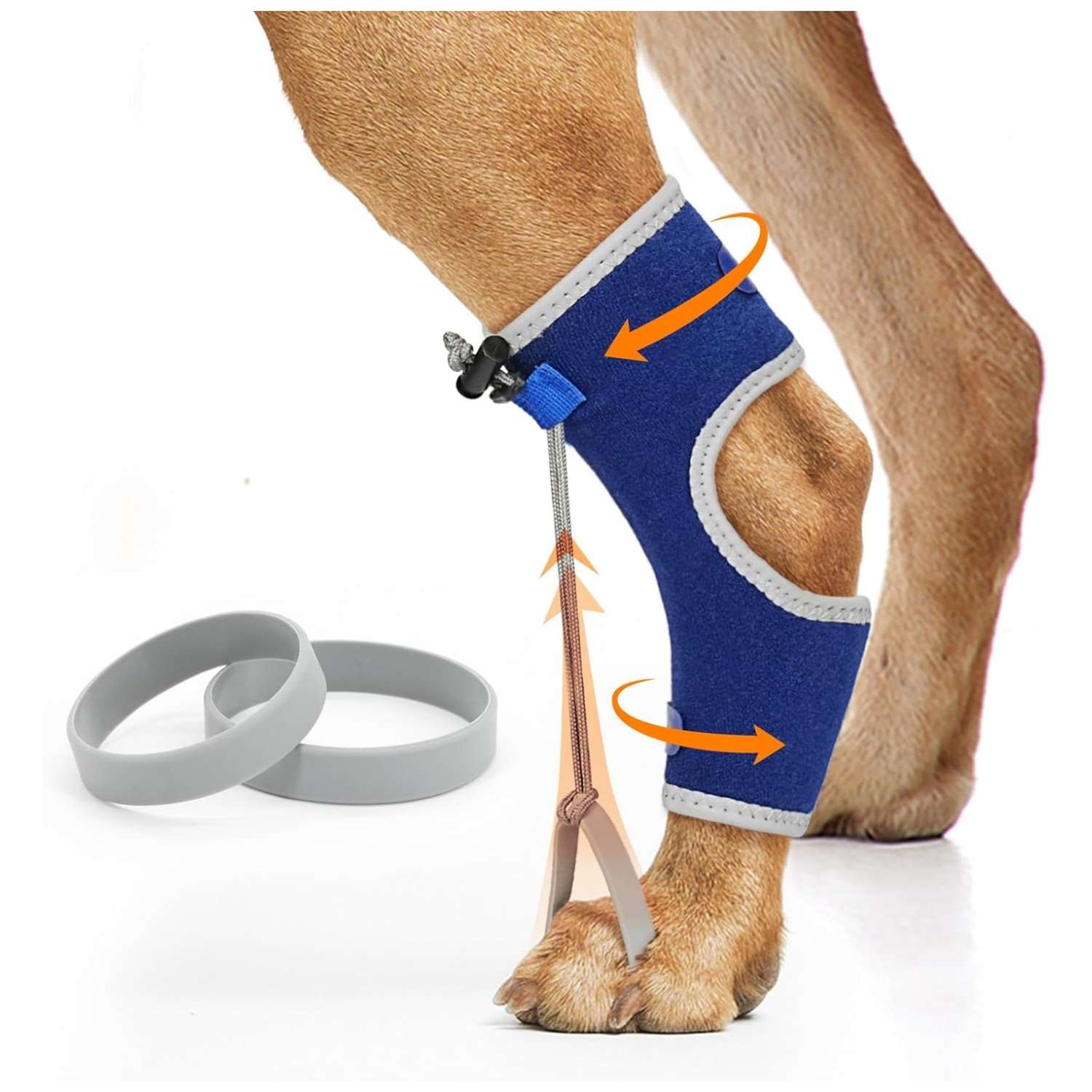 Ajuste Seguro: Muchos soportes se caen al caminar. Este modelo cuenta con correas internas y externas que se cruzan para fijar el soporte firmemente al corvejón, asegurando que se mantenga en su lugar tanto en paseos como en reposo.