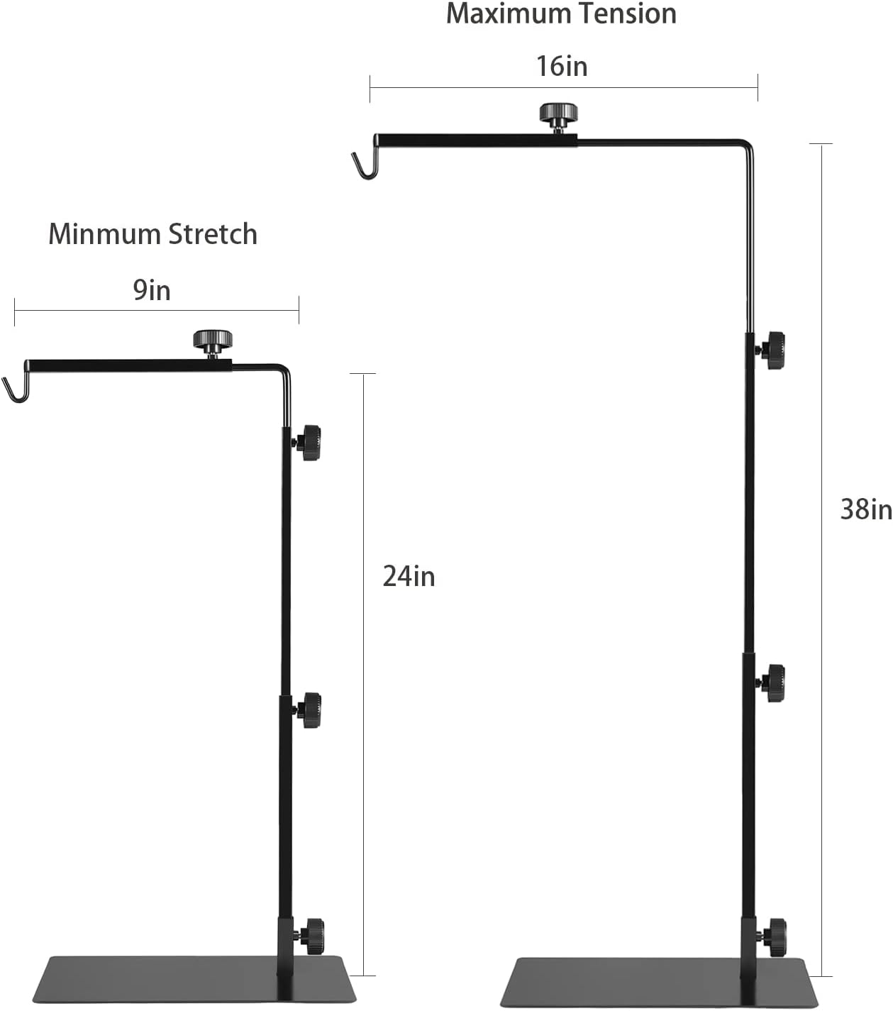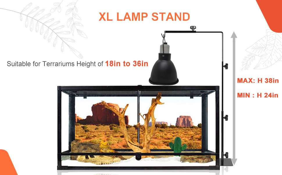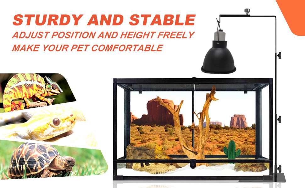 Cómodo ajuste libre La altura del soporte de la lámpara se puede ajustar: aproximadamente 24-38 pulgadas, rango telescópico en voladizo del gancho: aproximadamente 9-16 pulgadas. Puedes ajustar libremente la distancia y posición óptimas entre la bombilla de las luces de calor y tu mascota, haciendo que tu reptil esté más cómodo.