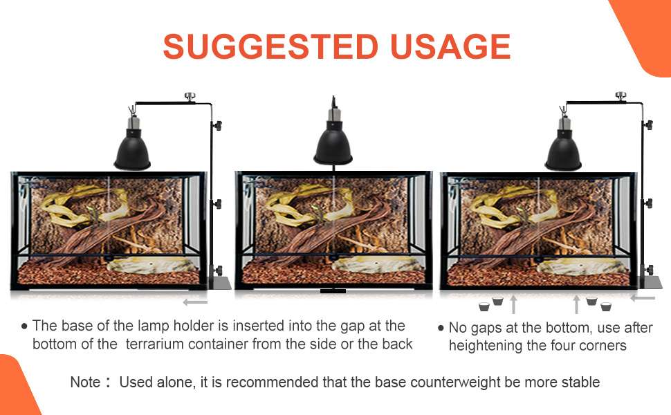 Amplia gama de usos: este soporte de luz de metal para suelo es más utilizado que el soporte de luces con clip. Se puede utilizar con varios terrarios, incubadoras, caja de cría, criadores, jaulas o tanque. Es adecuado para todo tipo de reptiles, anfibios y animales pequeños, incluyendo dragones barbudos, tortugas, gecko, lagarto, rana, serpiente, camaleón, polluelos, conejos, etc.