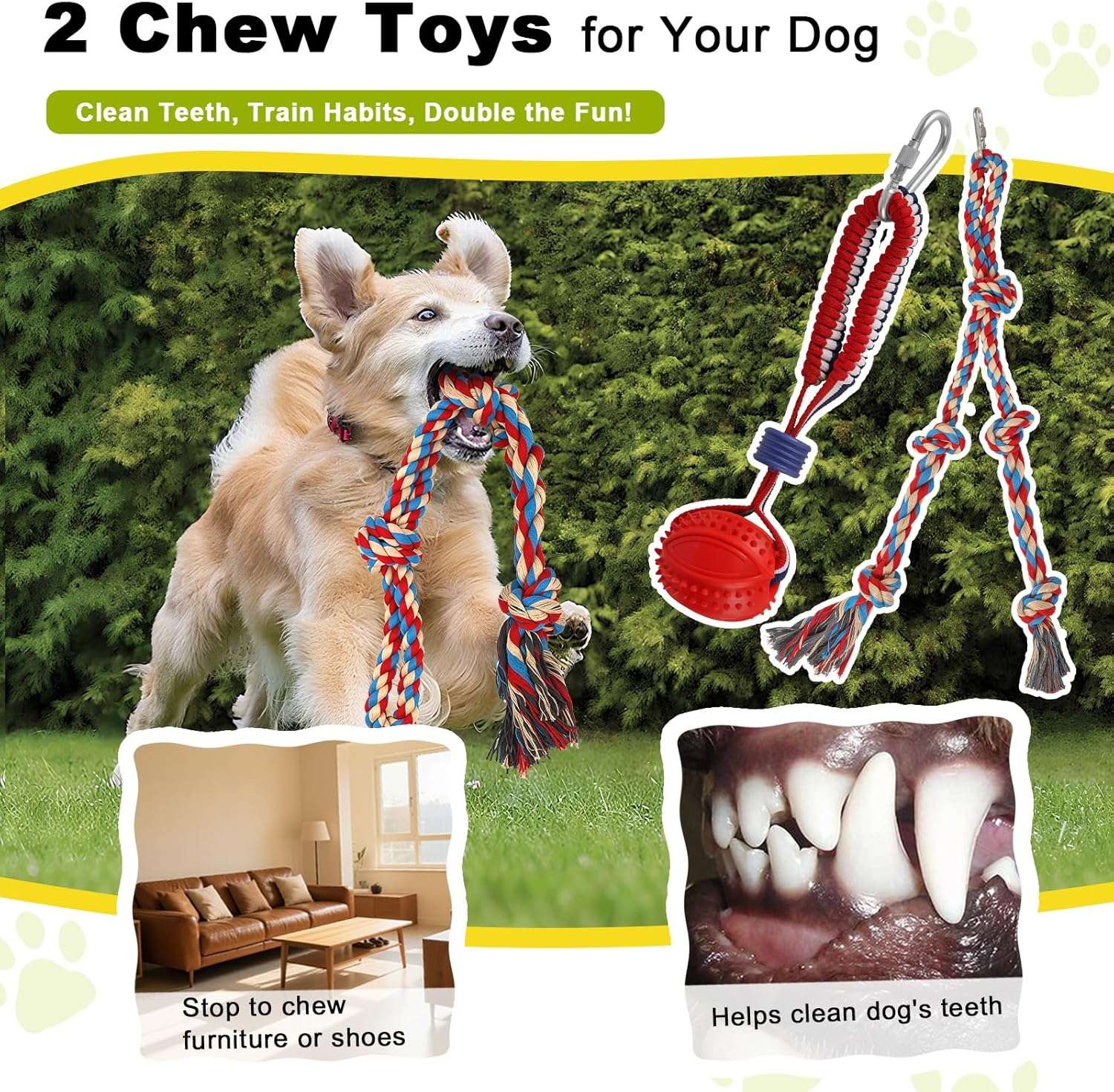 El set incluye dos juguetes masticables de alta durabilidad una cuerda de algodon suave y una bola especial para morder Estos accesorios no solo entretienen a su perro sino que ayudan a limpiar sus dientes y redirigen su instinto natural de morder alejandolo de sus zapatos o muebles promoviendo habitos de juego totalmente saludables