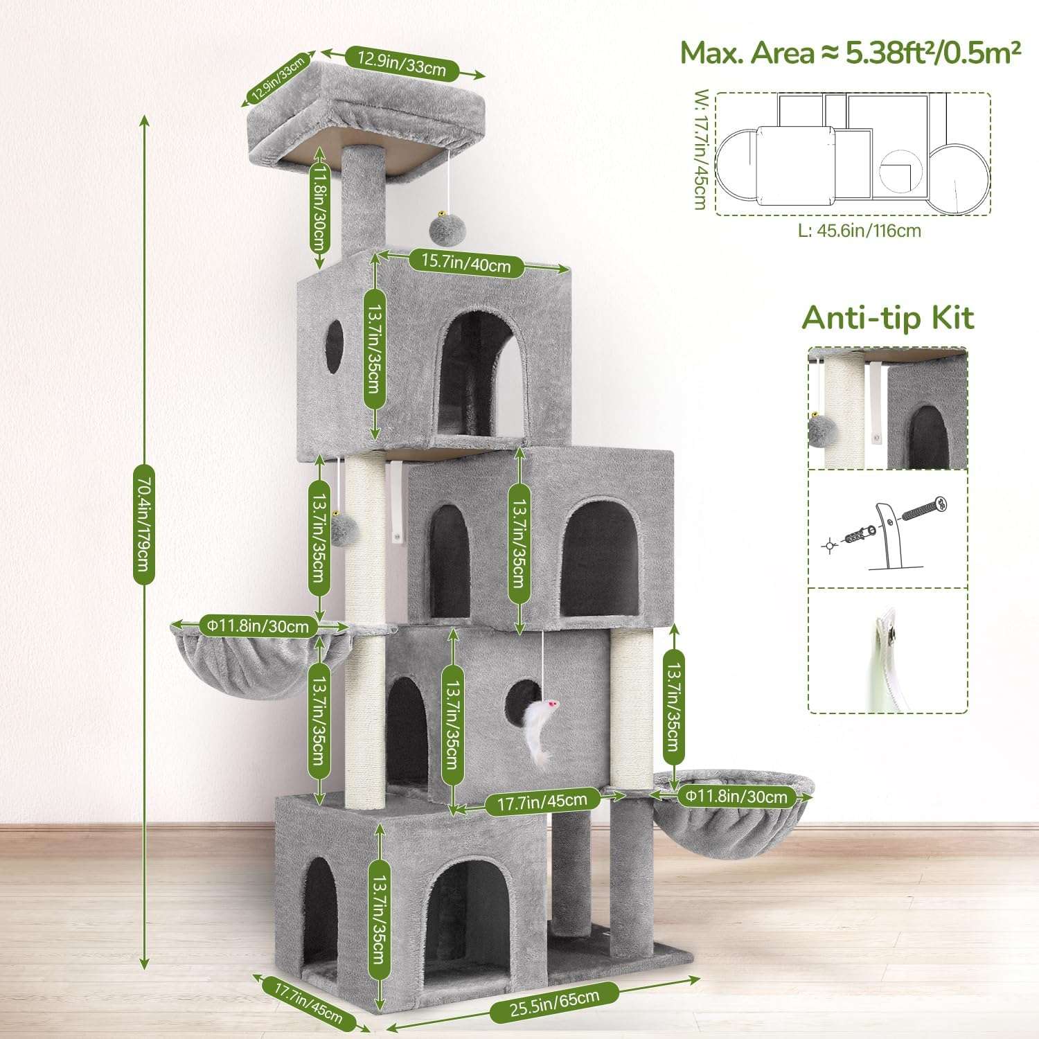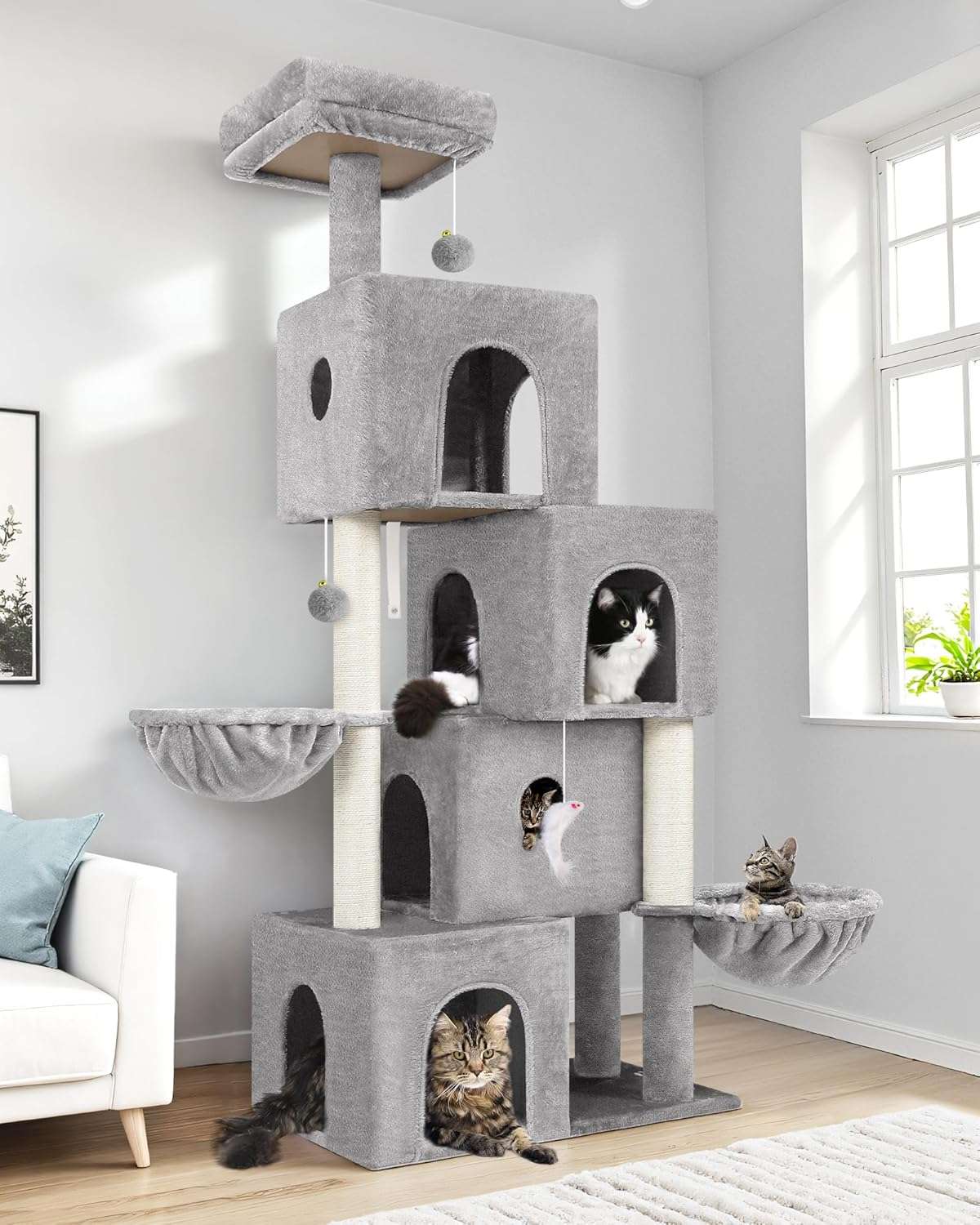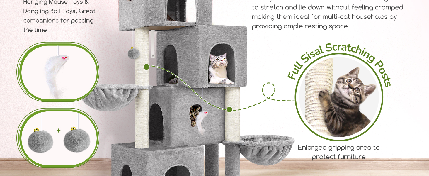 Decoracion Innovadora y Seguridad: Con esquemas de color cuidadosamente seleccionados, este mueble decora su hogar. Ademas, cada nivel esta meticulosamente diseñado para proporcionar estabilidad estructural, creando un entorno seguro para que los gatos jueguen sin riesgos.