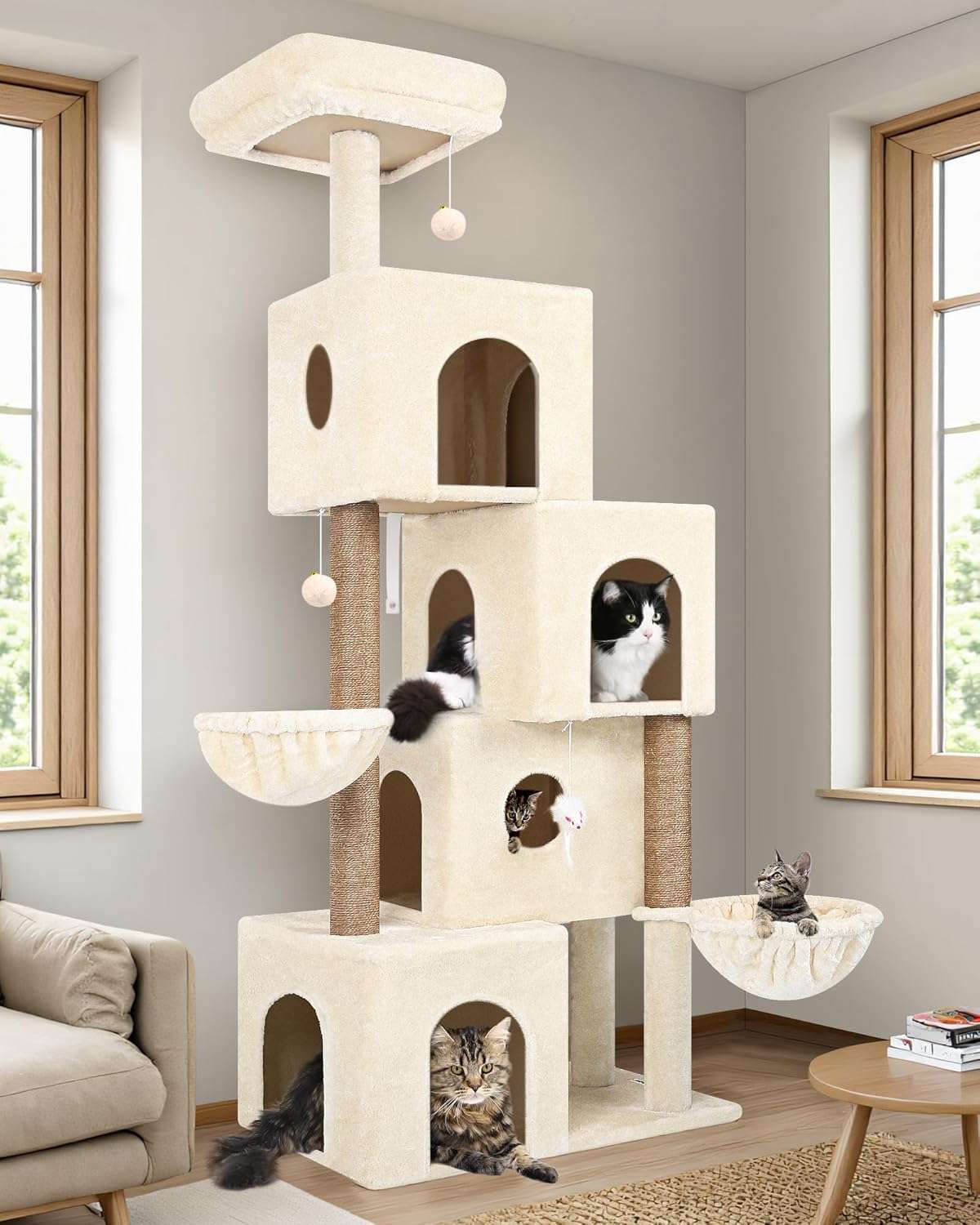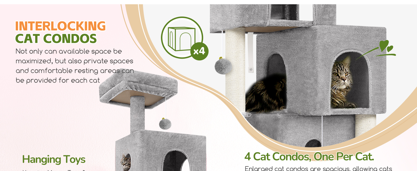 Espacios Amplios para Gatos Grandes: Diseñado con dimensiones mas grandes, estos condominios permiten que los gatos adultos se estiren y se acuesten sin sentirse confinados. Ofrece espacios de descanso adecuados y comodos para hogares con varios gatos grandes.