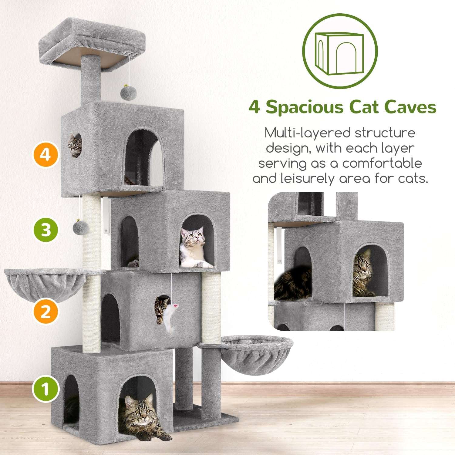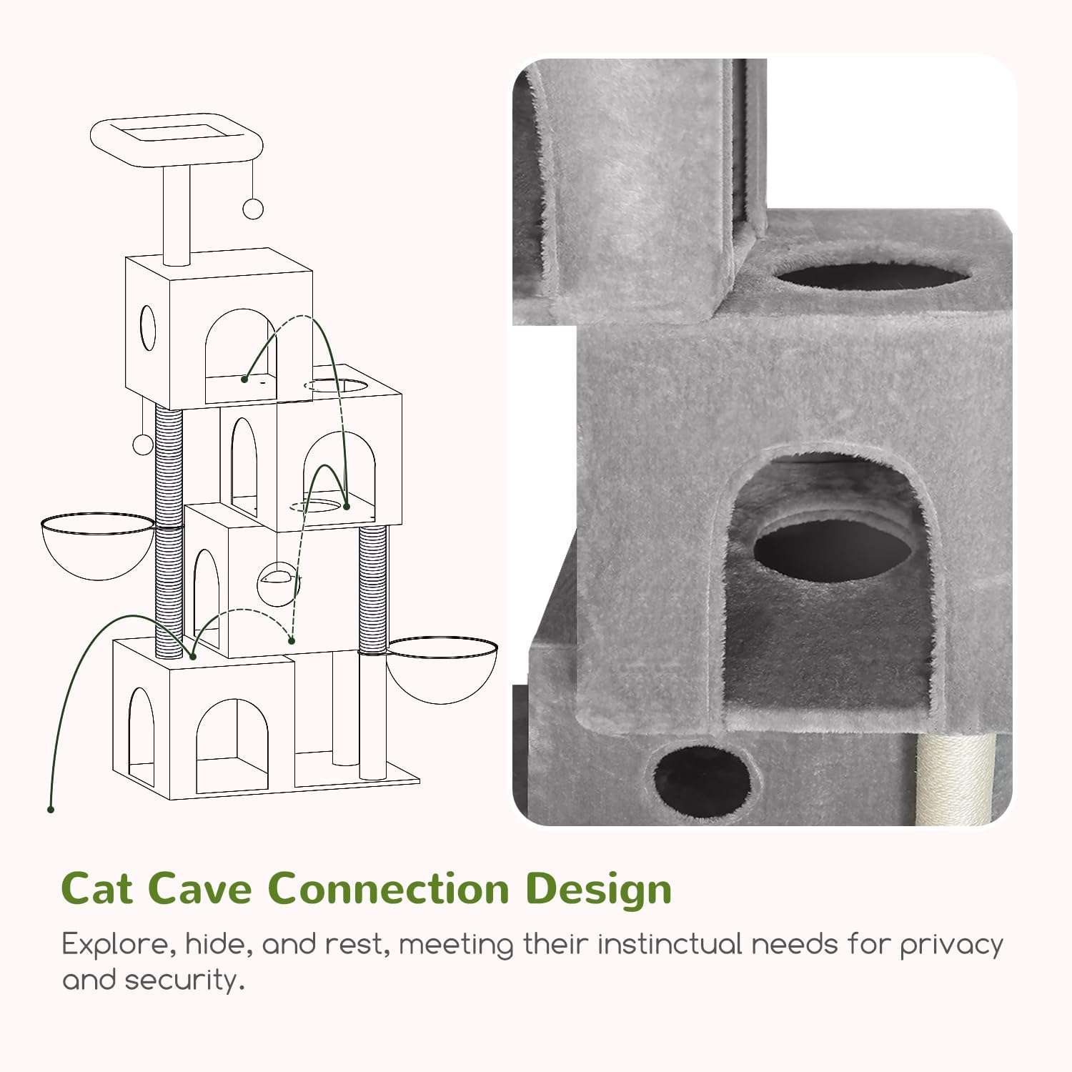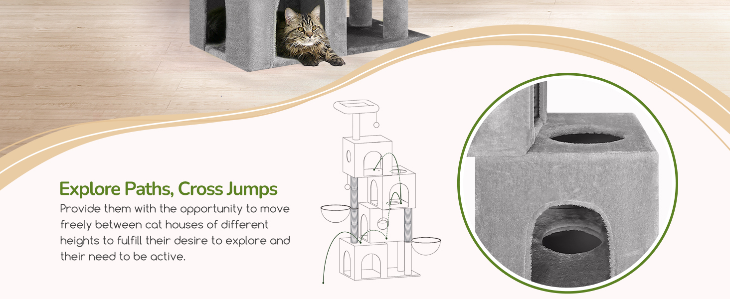 Curiosidad y Exploracion Tipo Tunel: Cada nivel cuenta con un agujero de 18 centimetros (7.09 pulgadas) que conecta los cuatro condominios en un diseño similar a un tunel. Esto enciende la curiosidad y el espiritu aventurero de los gatos, permitiendoles subir y bajar internamente disfrutando de la alegria de explorar.