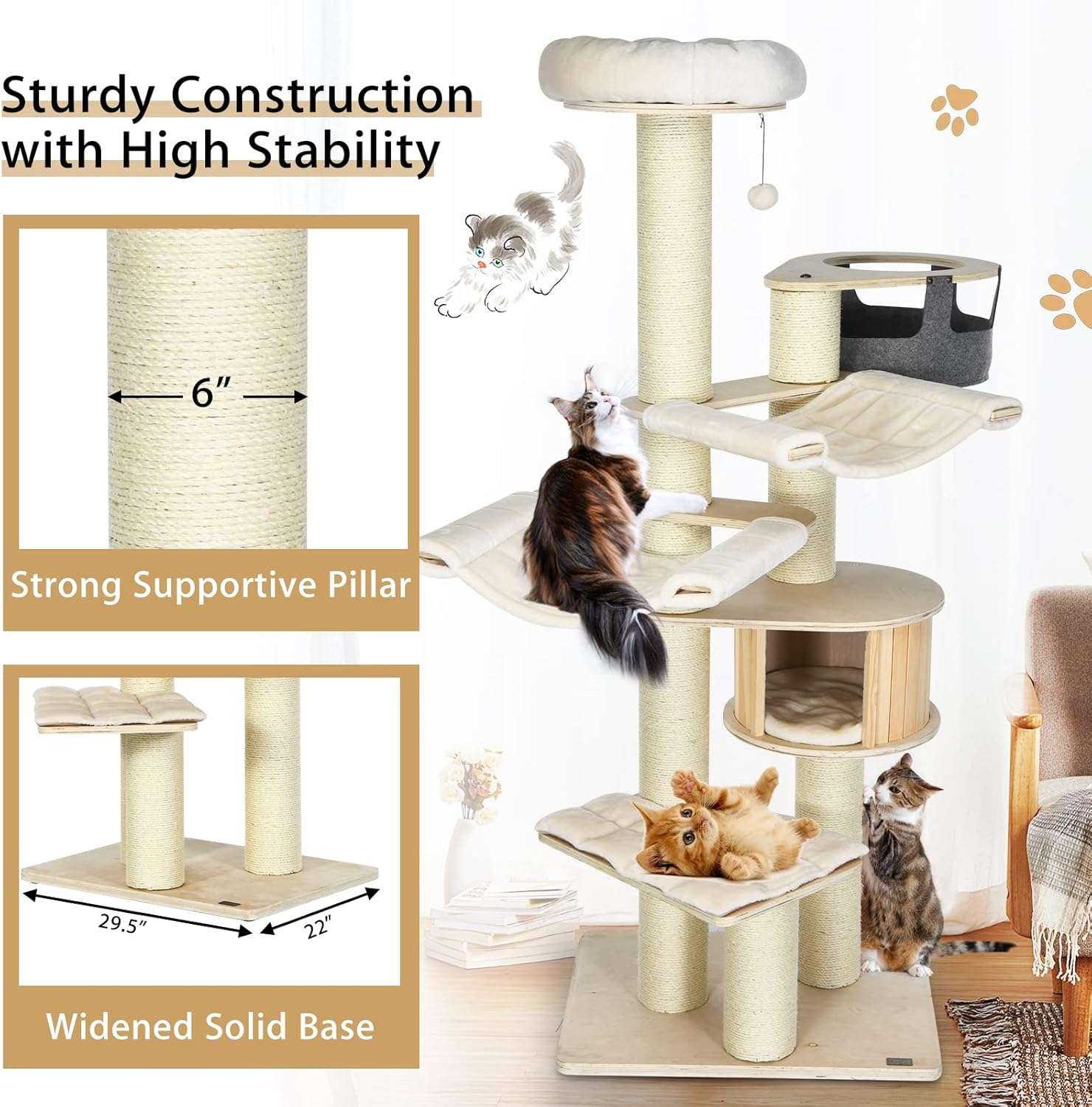 Parque de Aventura Extra Alto y Todo en Uno: Altura Maxima: Con 197 centimetros de alto, esta torre sera un refugio fantastico y un desafio emocionante para su gato. Refugios de Lujo: Equipado con condominio privado, percha superior, cesta colgante, hamaca y bolas colgantes.