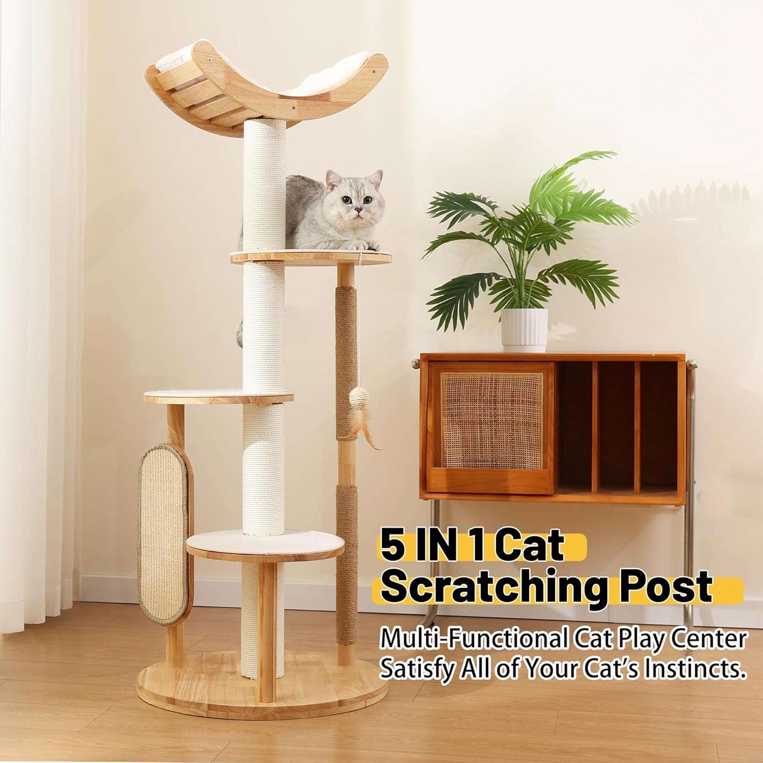 Centro de Actividades 5 en 1: Combina escalada, descanso, arañazos y juego. Incluye un poste alto envuelto en lino, cuatro columnas cubiertas de sisal y un juguete colgante.