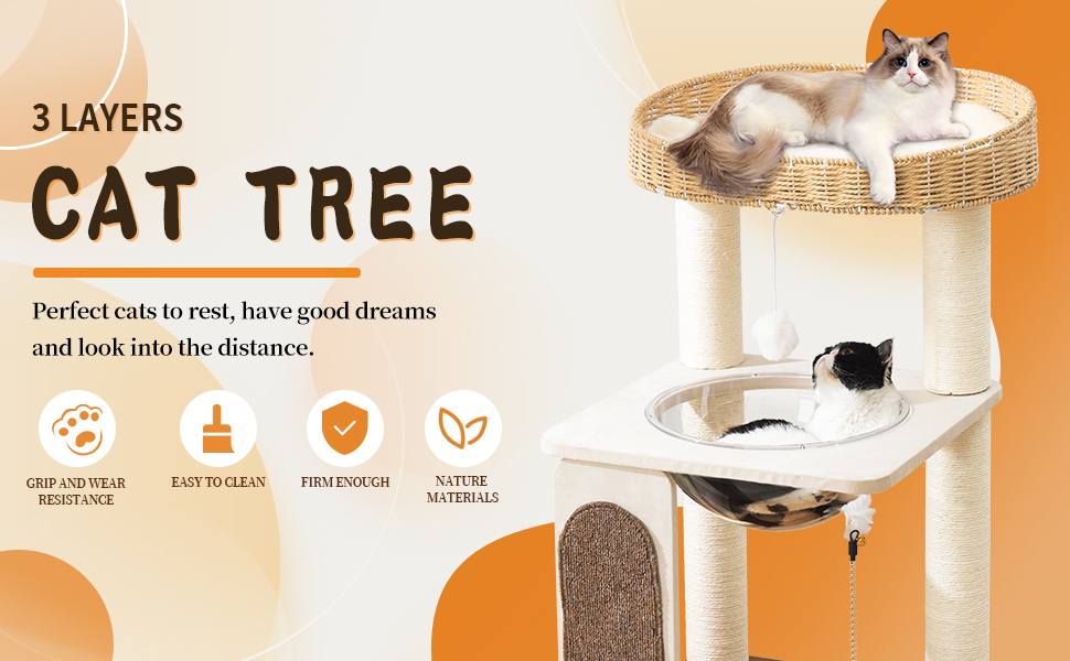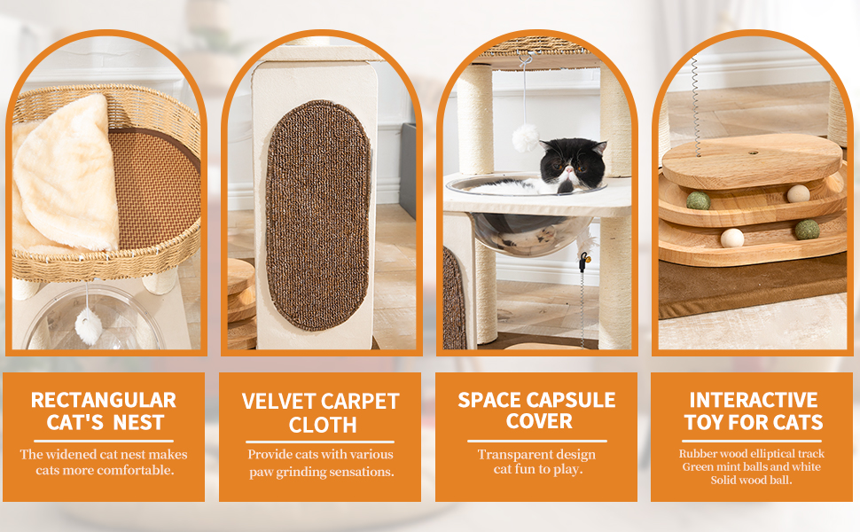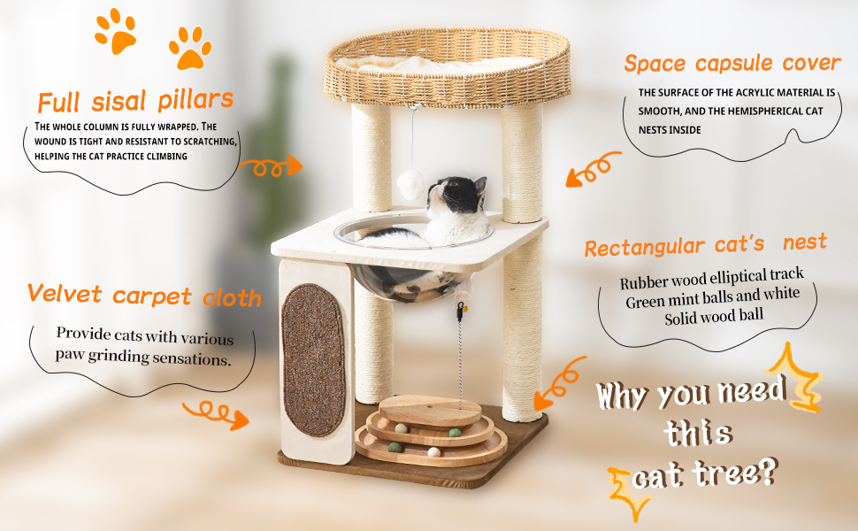 Diseño Unico con Capsula y Nido Artesanal: Con una altura de 76 centimetros, adopta un diseño de tres niveles. Incluye un nido de capsula espacial transparente que a los gatos les encanta y un nido de cuerda de papel kraft tejida a mano con cojin suave. Es una pieza estetica y funcional.