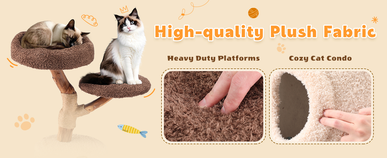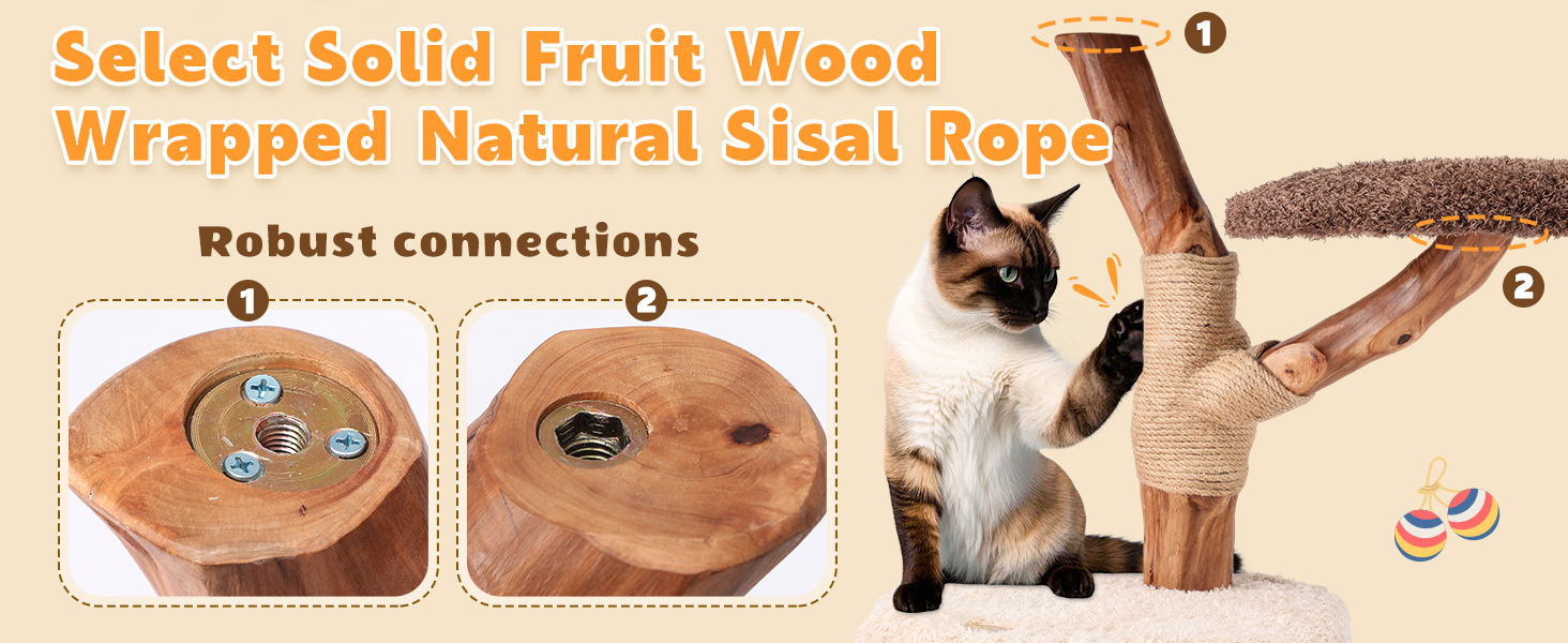 Madera de Arbol Frutal y Diseño Unico: Cuenta con ramas de madera natural pulidas a mano de 5 a 8 centimetros de diametro. Cada pieza tiene un patron de grano unico. El tronco esta envuelto con yute natural hilado a mano, proporcionando la superficie ideal y duradera para que los gatos mantengan sus garras.