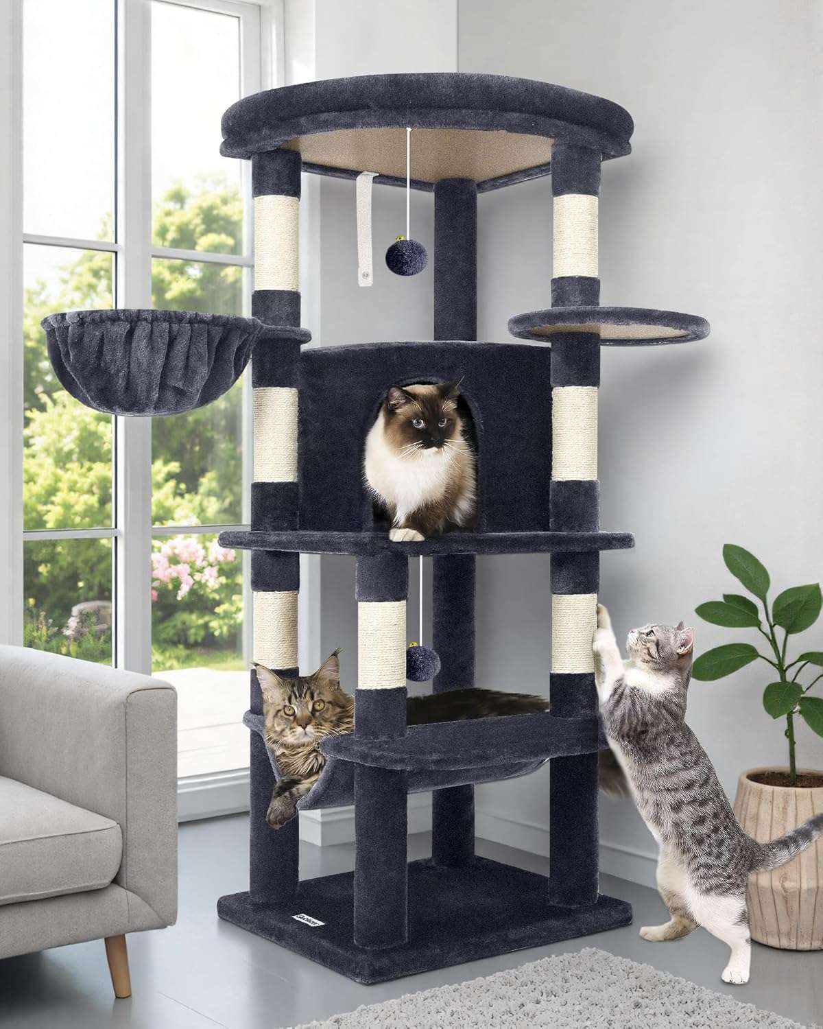 7 Postes de Sisal Natural: Equipada con 7 postes rascadores cubiertos de sisal natural resistente. Estos postes son perfectos para las necesidades de arañar de su gato de interior, protegiendo sus muebles de daños y manteniendo las garras saludables mientras escalan y exploran.