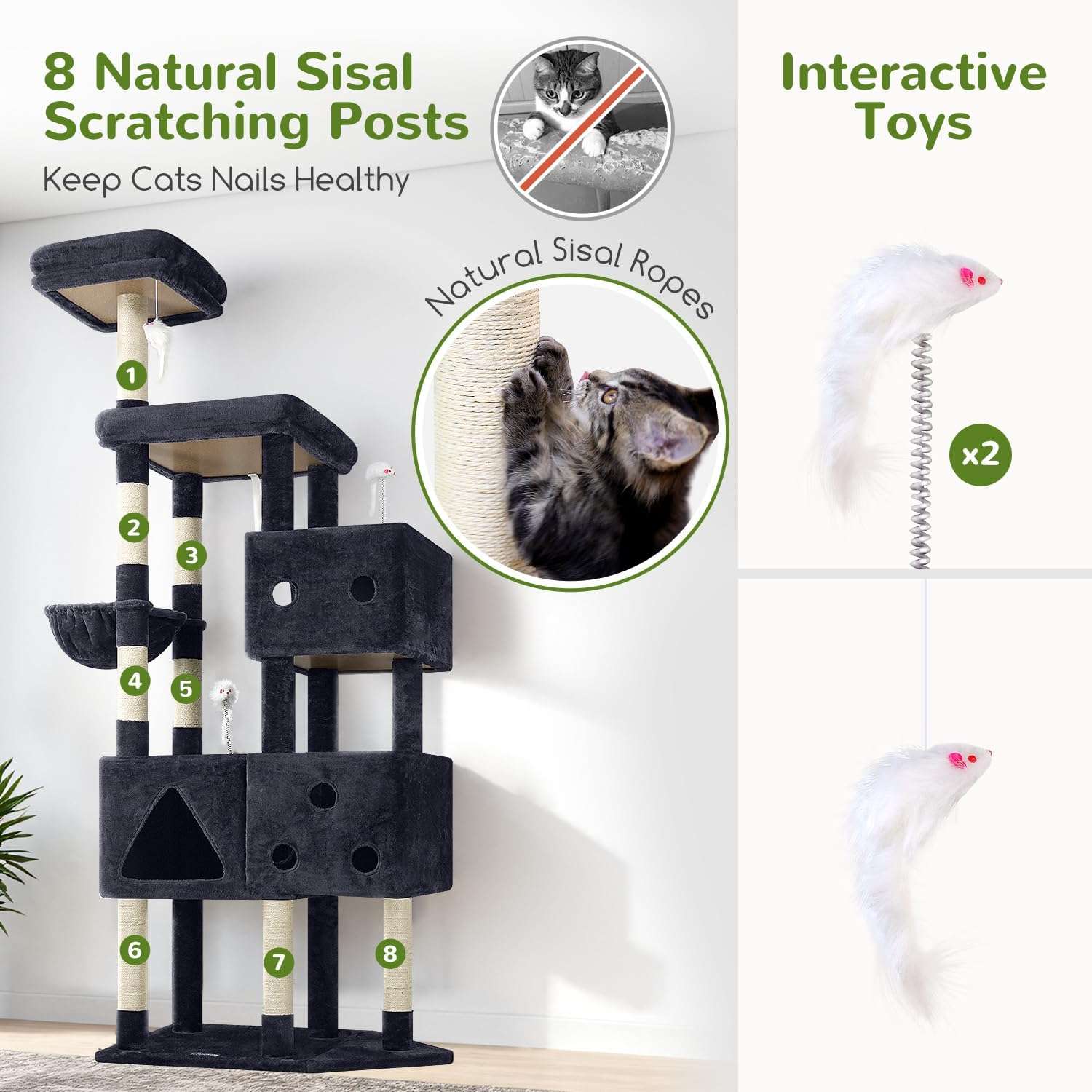 Altura Impresionante y Diseño Multinivel: Mide 207 centimetros de alto con una base de 85 por 45 centimetros. Su diseño de varios niveles permite que los gatos salten entre diferentes alturas, hagan ejercicio y se mantengan activos. Es perfecta para gatos adultos grandes de hasta 9 kilos.