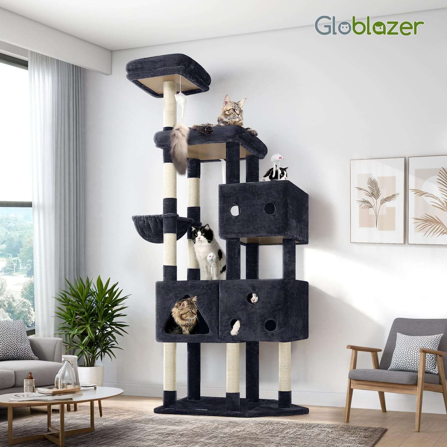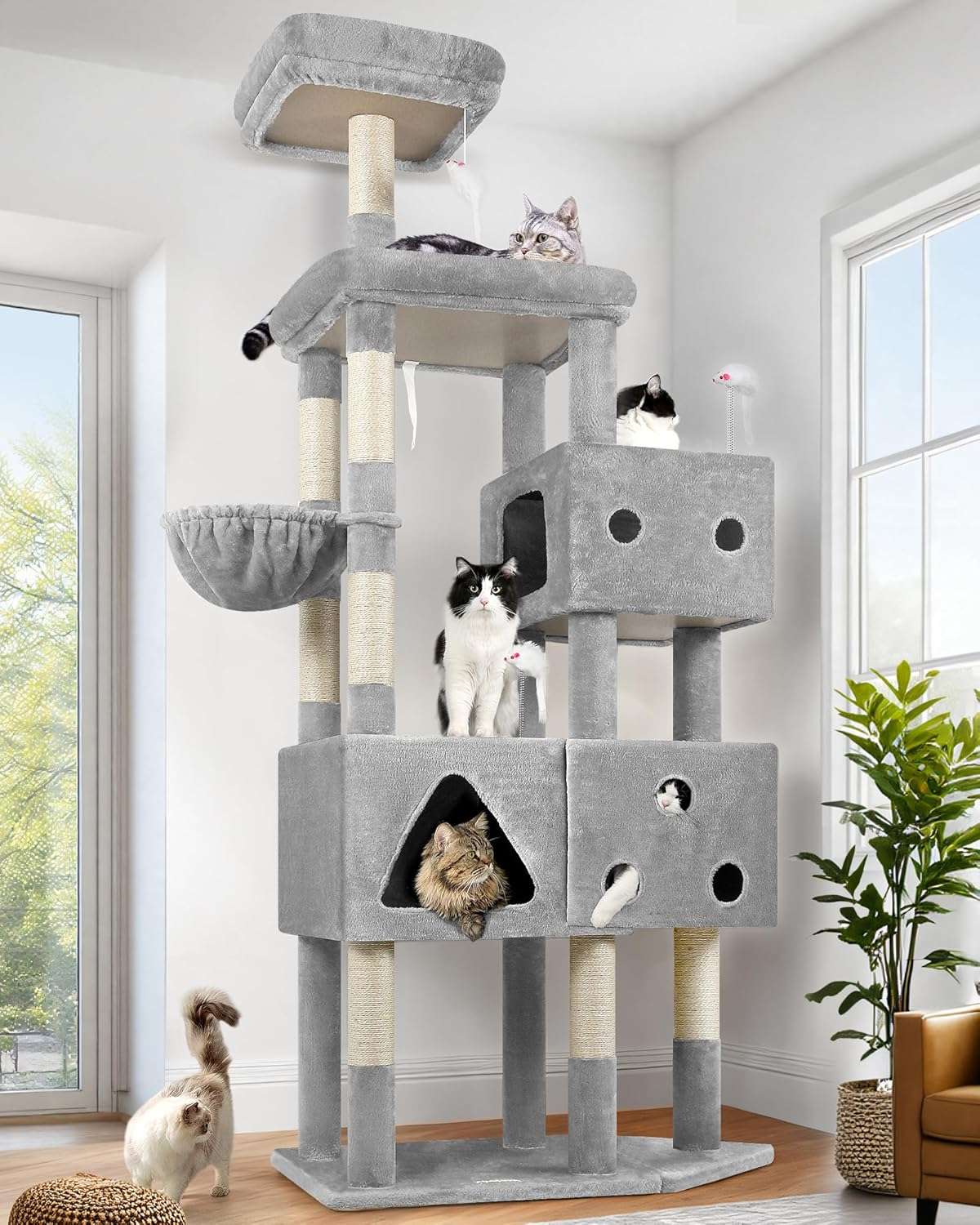 Esta torre es una verdadera mansion vertical para sus mascotas. Con una altura impresionante de 207 centimetros y una base amplia, esta diseñada para que hasta 6 gatos adultos convivan, jueguen y descansen sin disputas territoriales.