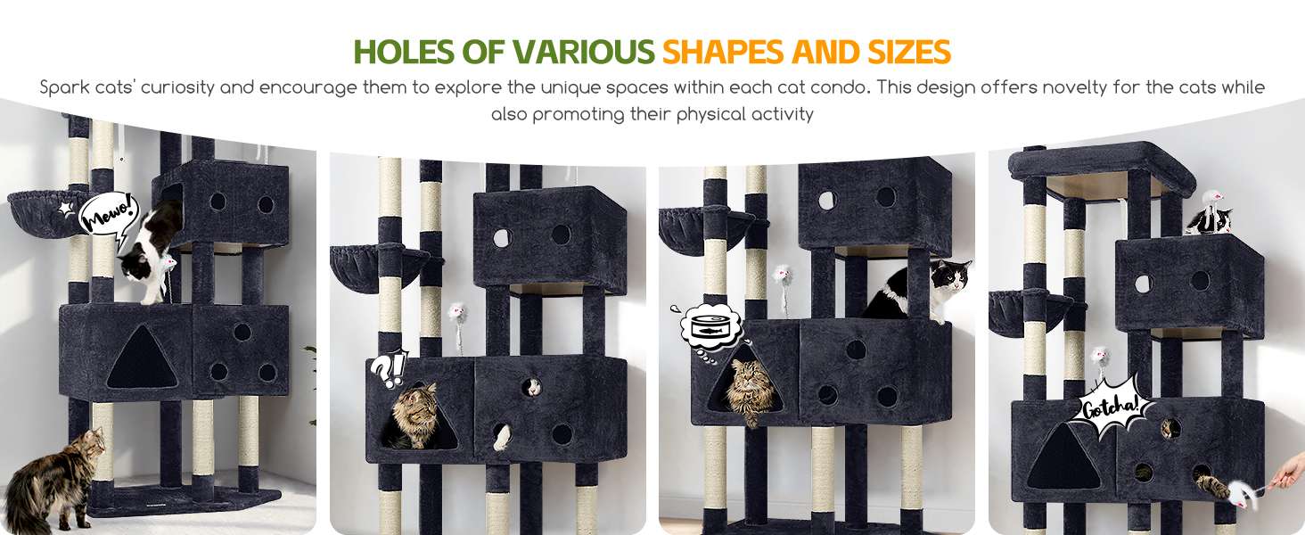 3 Condominios con Diseño Unico: Esta torre cuenta con 3 cuevas o casas de diseño exclusivo. Cada una tiene diferentes aberturas y formas, lo que añade un elemento de diversion y exploracion, fomentando la curiosidad mientras les ofrece un escondite seguro.