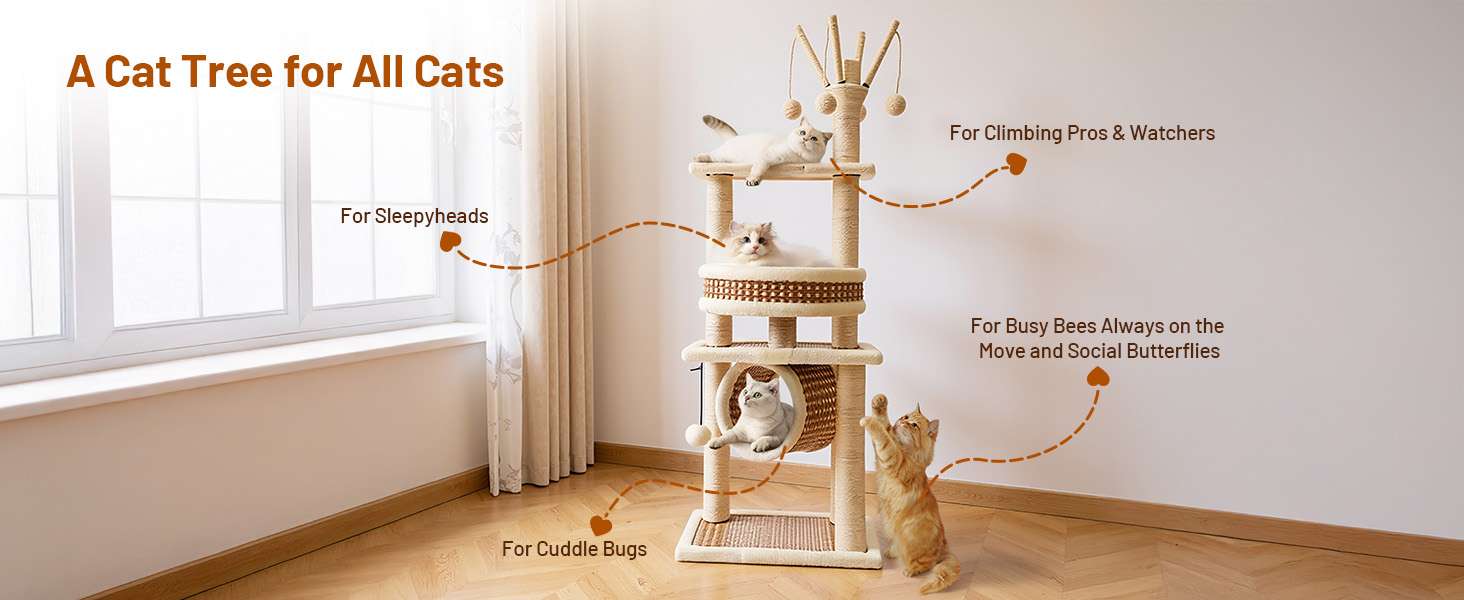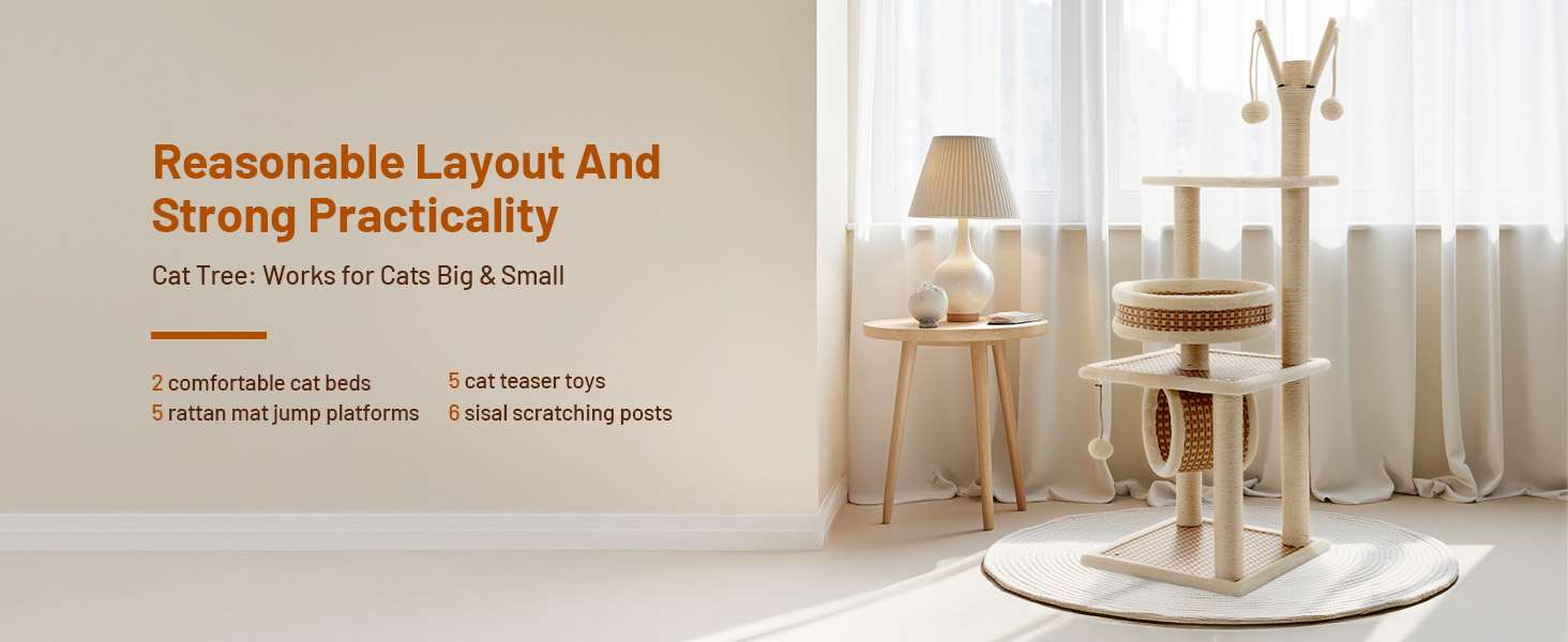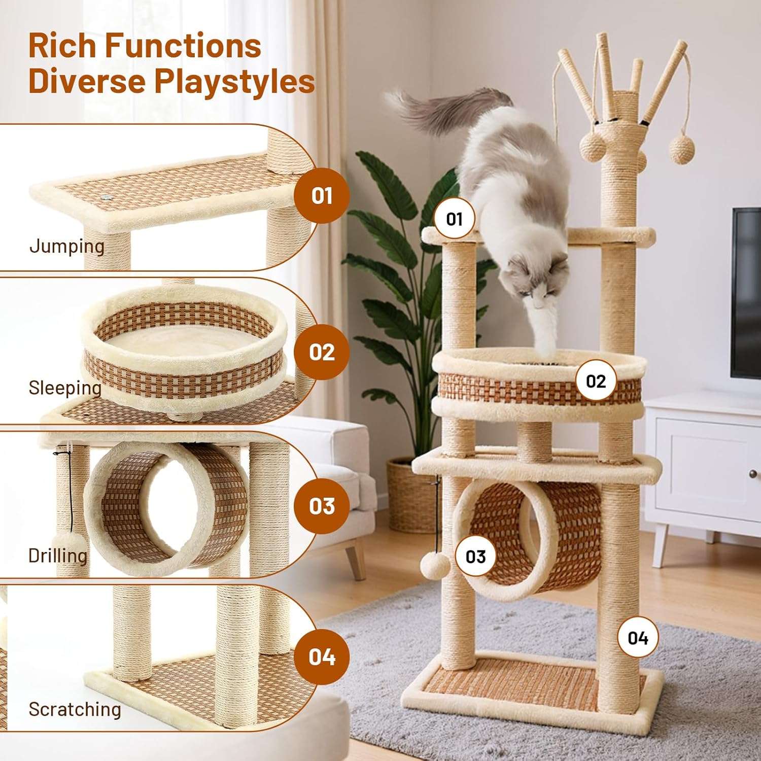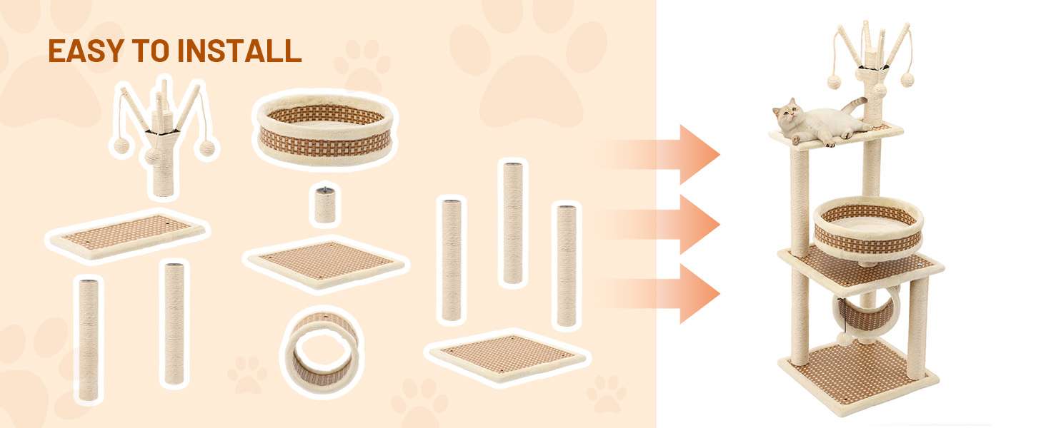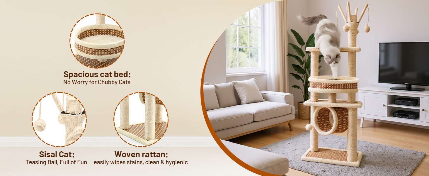 Materiales Ecologicos y Diversion Vertical: Materiales Seguros: Utiliza tablero de particulas de grado E2 (sin formaldehido) y postes envueltos en sisal natural para un rascado seguro. El nido de ratan tejido a mano es no toxico y duradero.