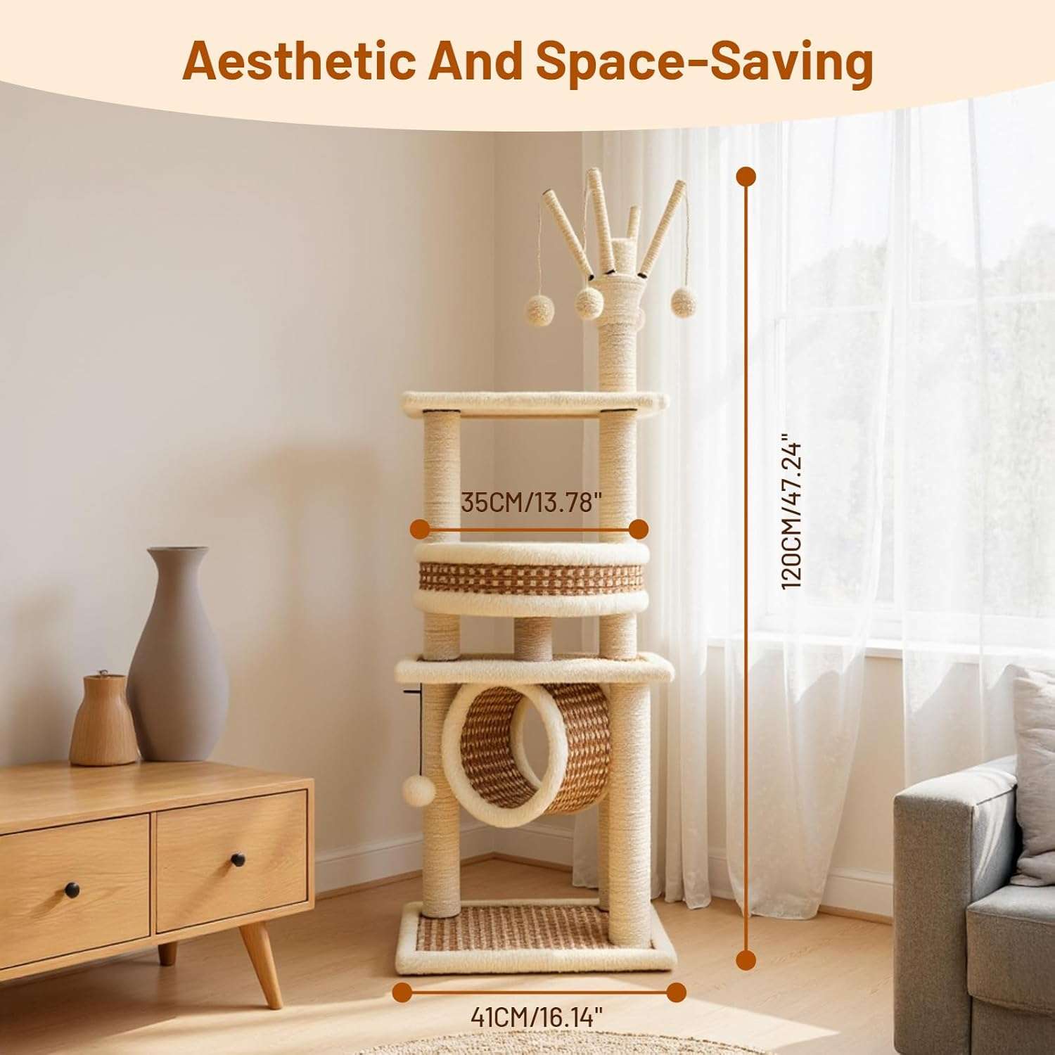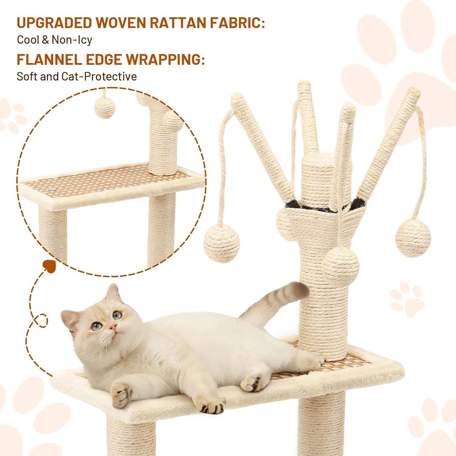 Diseño Ultra Resistente y Elegante: Estructura de Acero: Reforzado con un marco de acero y una base ancha anti-punta, este arbol soporta hasta 26 libras (aproximadamente once punto ocho kilogramos), garantizando estabilidad. Acabado Duradero: El acabado con recubrimiento en polvo es resistente a los arañazos, lo que asegura un uso duradero y mantiene la torre elegante. Estetica: La elegante cesta de ratan combina perfectamente con la decoracion moderna del hogar.