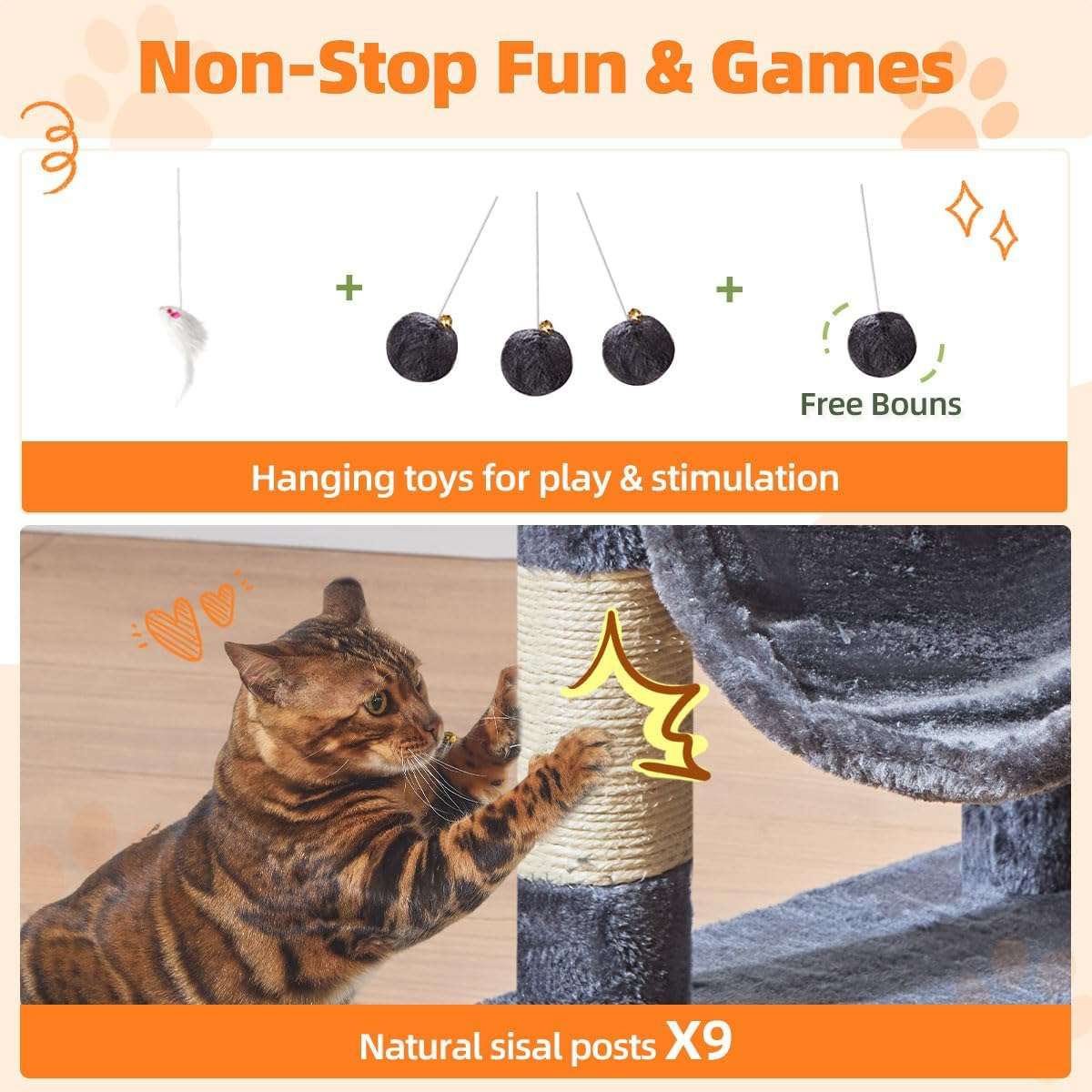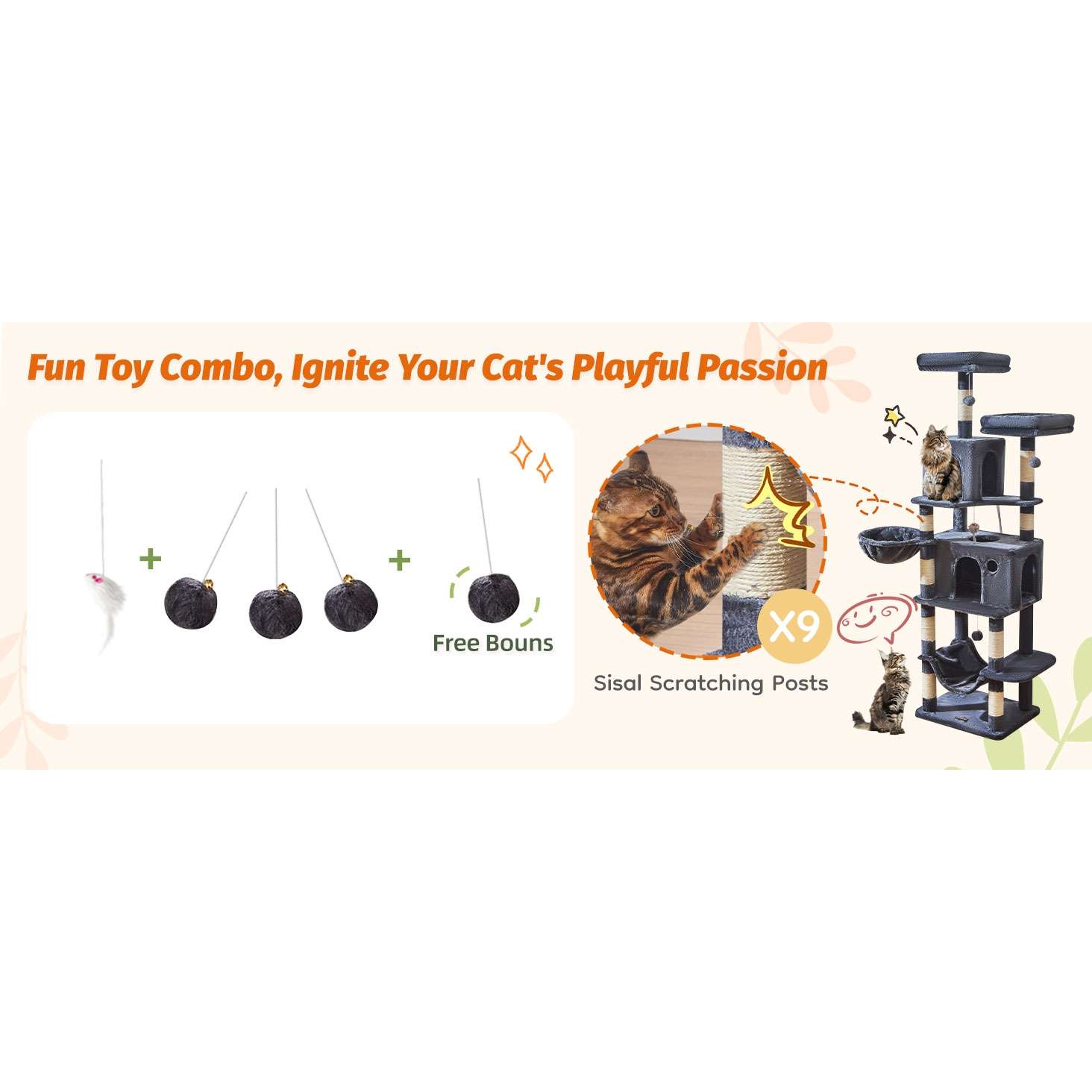 Rascadores Duraderos: Incluye 12 postes rascadores cubiertos completamente de sisal, lo que permite a sus gatos afilar sus garras sin dañar sus muebles.