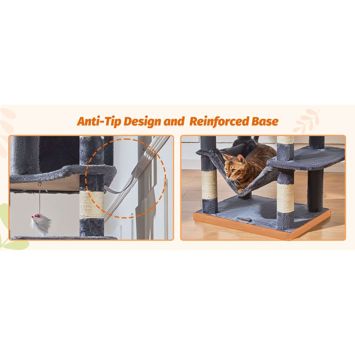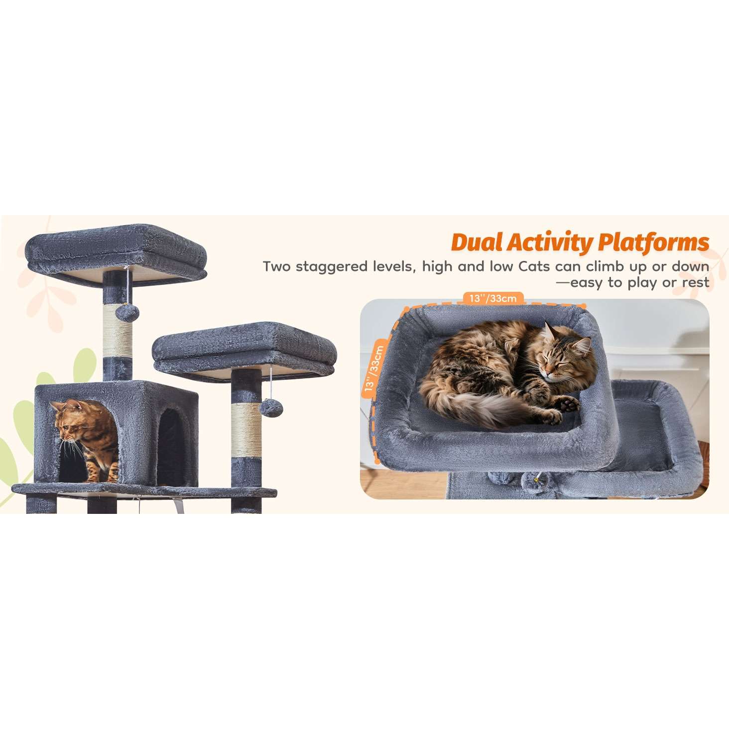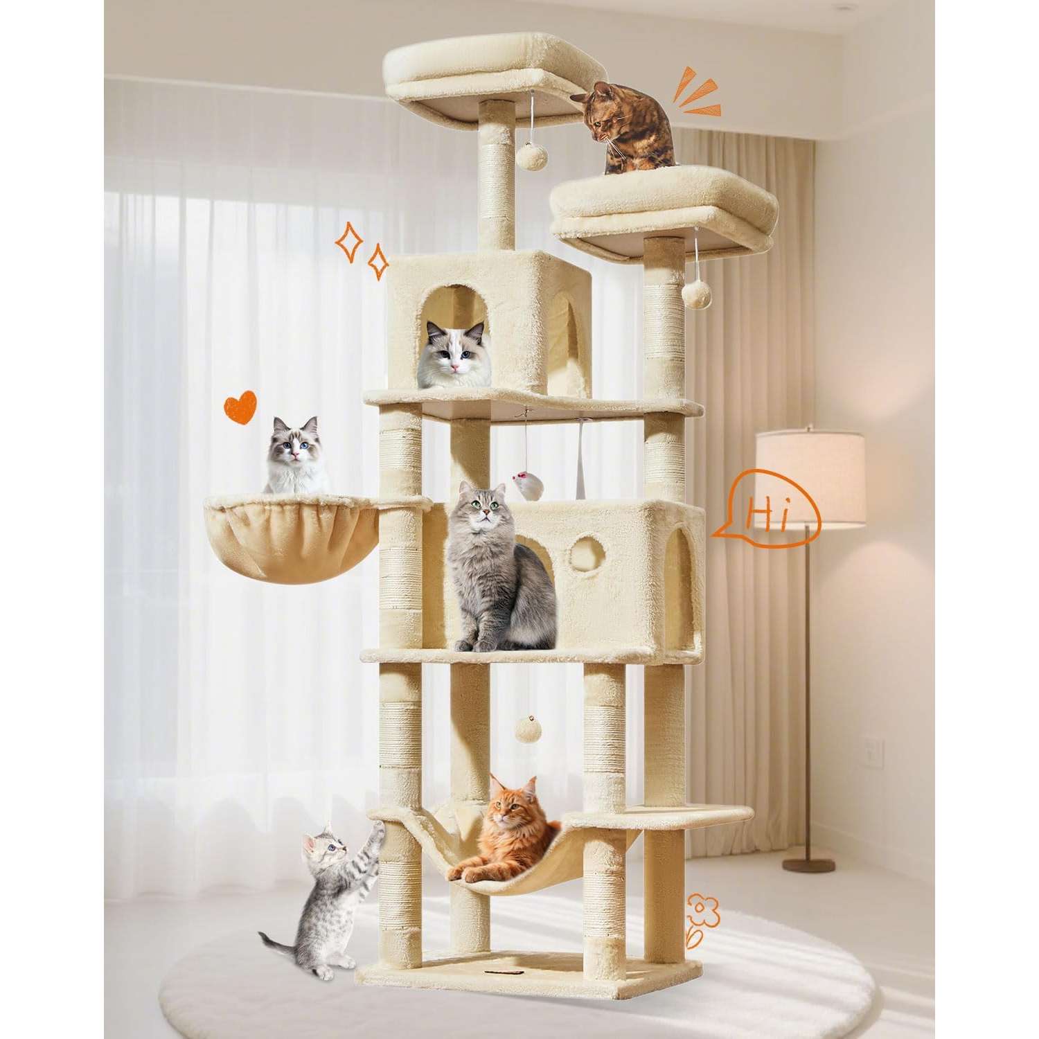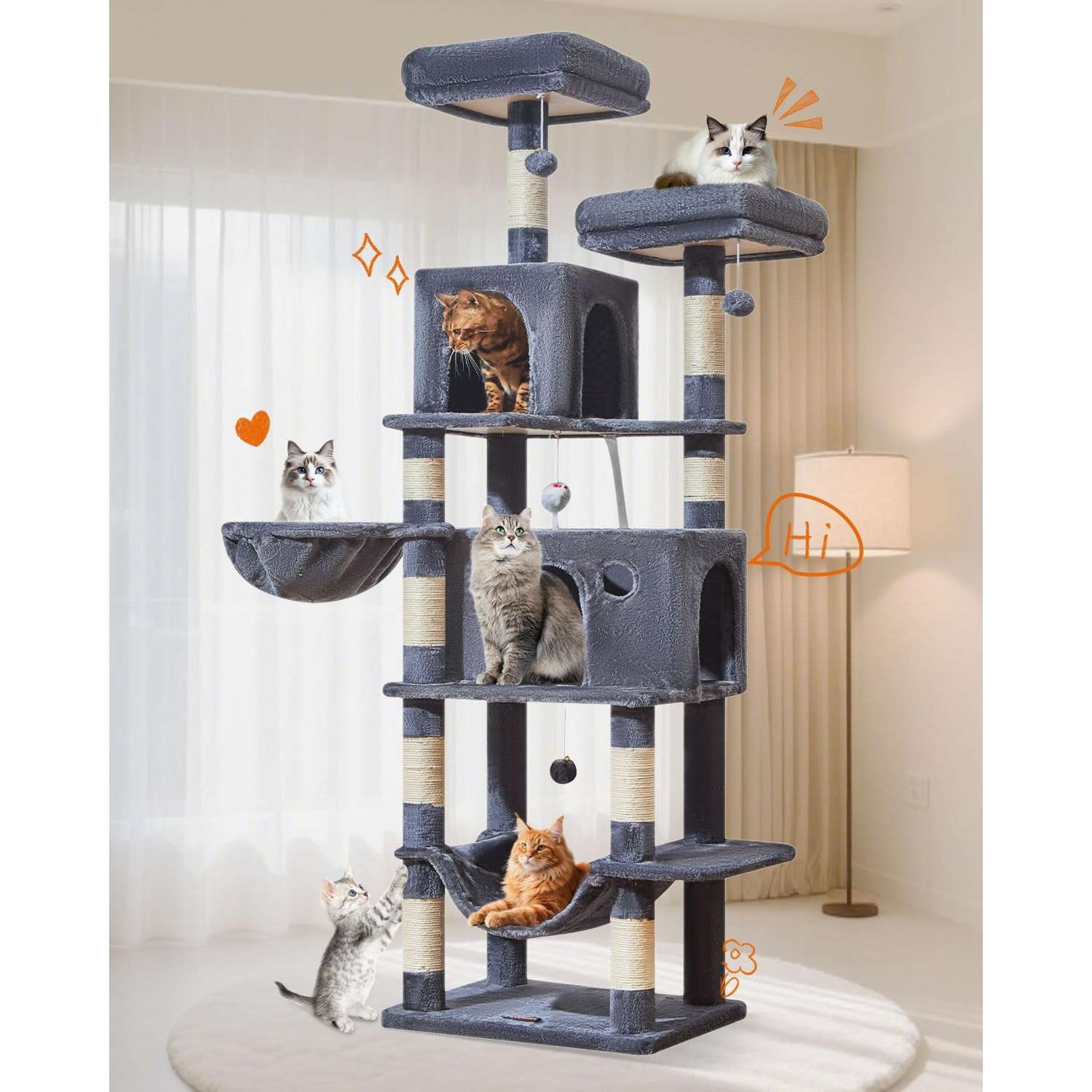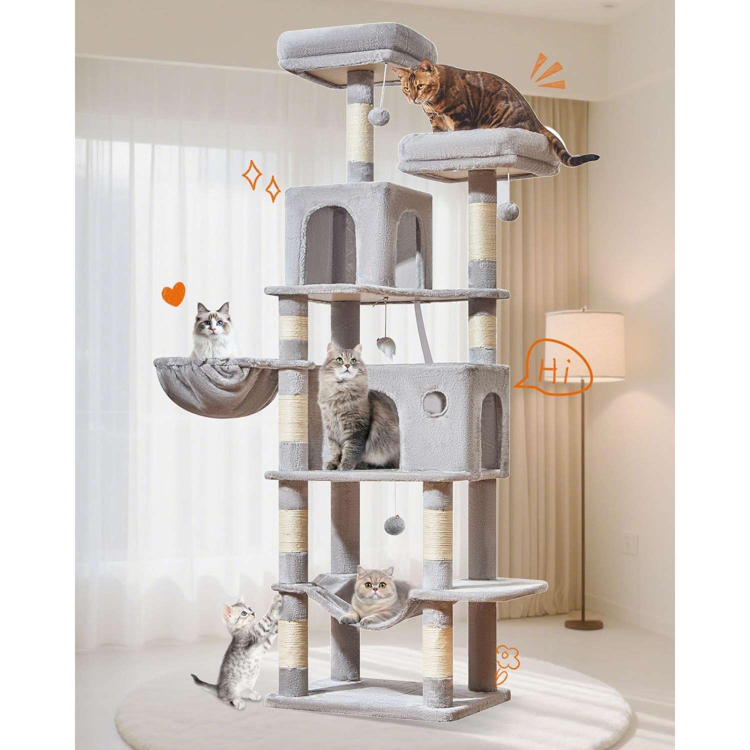 Este es un árbol para gatos alto y multi-nivel, ideal para el juego y el descanso de sus mascotas en interior.