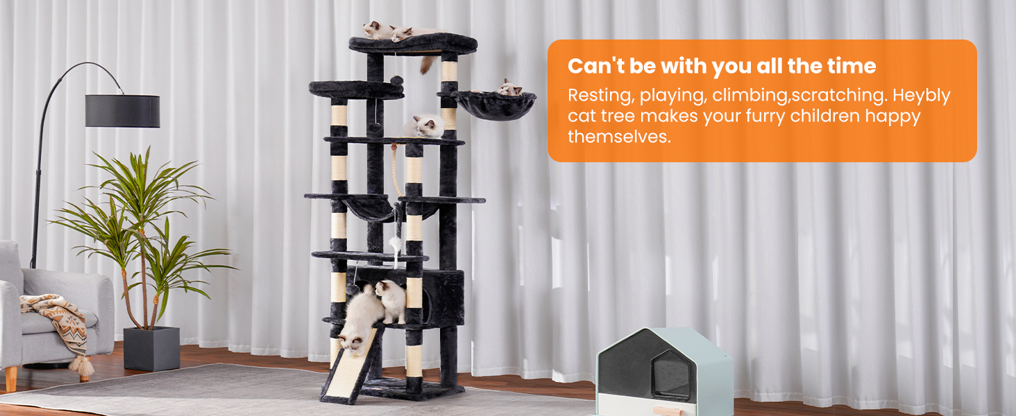 Esta torre rascadora ofrece un diseño multifuncional que se adapta al juego y descanso de gatos grandes y activos.