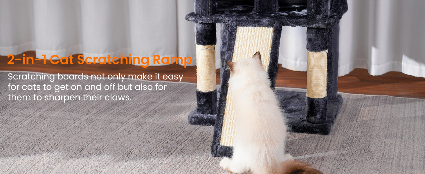 Rascadores Completos: Una amplia tabla de rascar y postes envueltos en sisal son perfectos para afilar garras y proteger sus muebles.