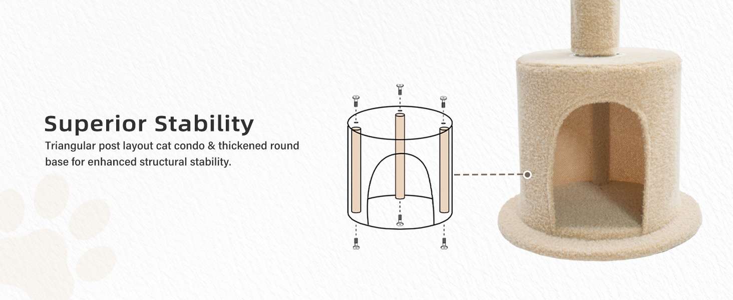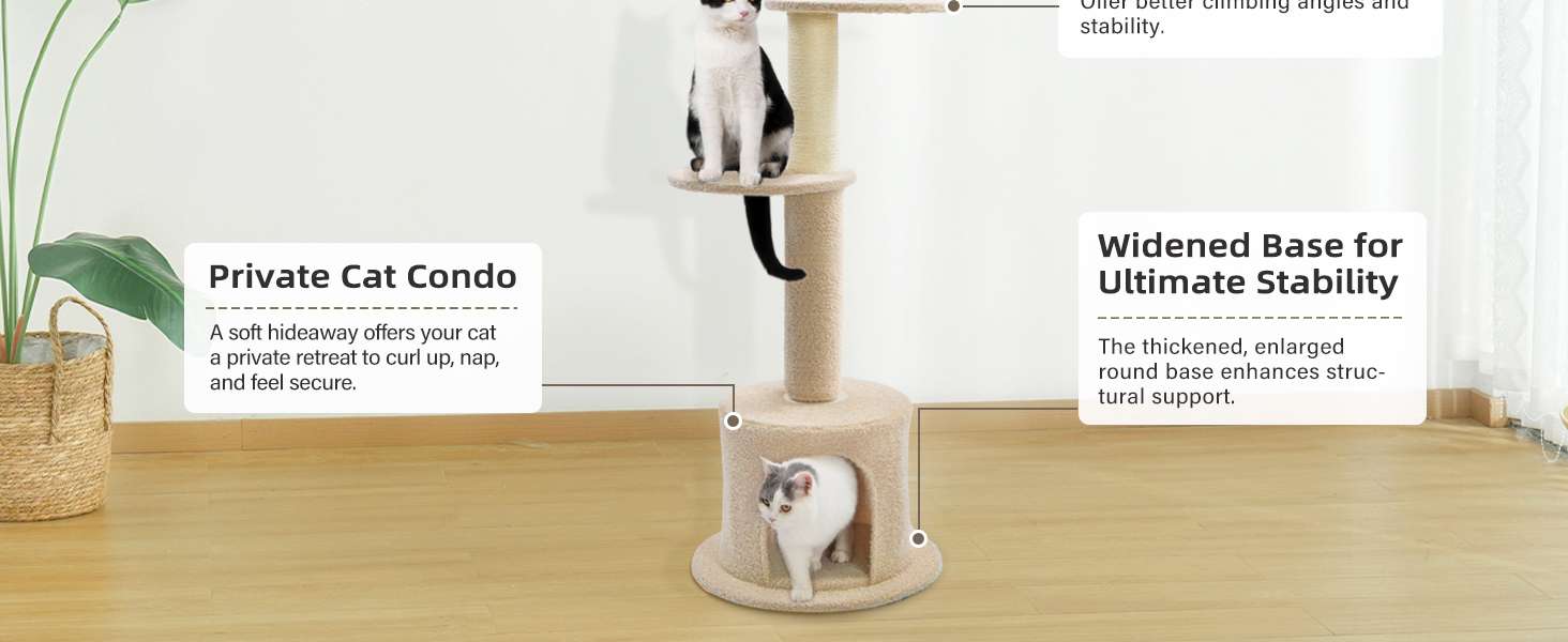 Seguridad y Firmeza Total: Base Reforzada: La base incluye un condominio reforzado con una plataforma gruesa y tres postes distribuidos en triángulos, proporcionando una base sólida para escalar. Privacidad y Seguridad: Ofrece un espacio acogedor y cerrado, ideal para siestas tranquilas o para gatos tímidos que buscan privacidad y comodidad.