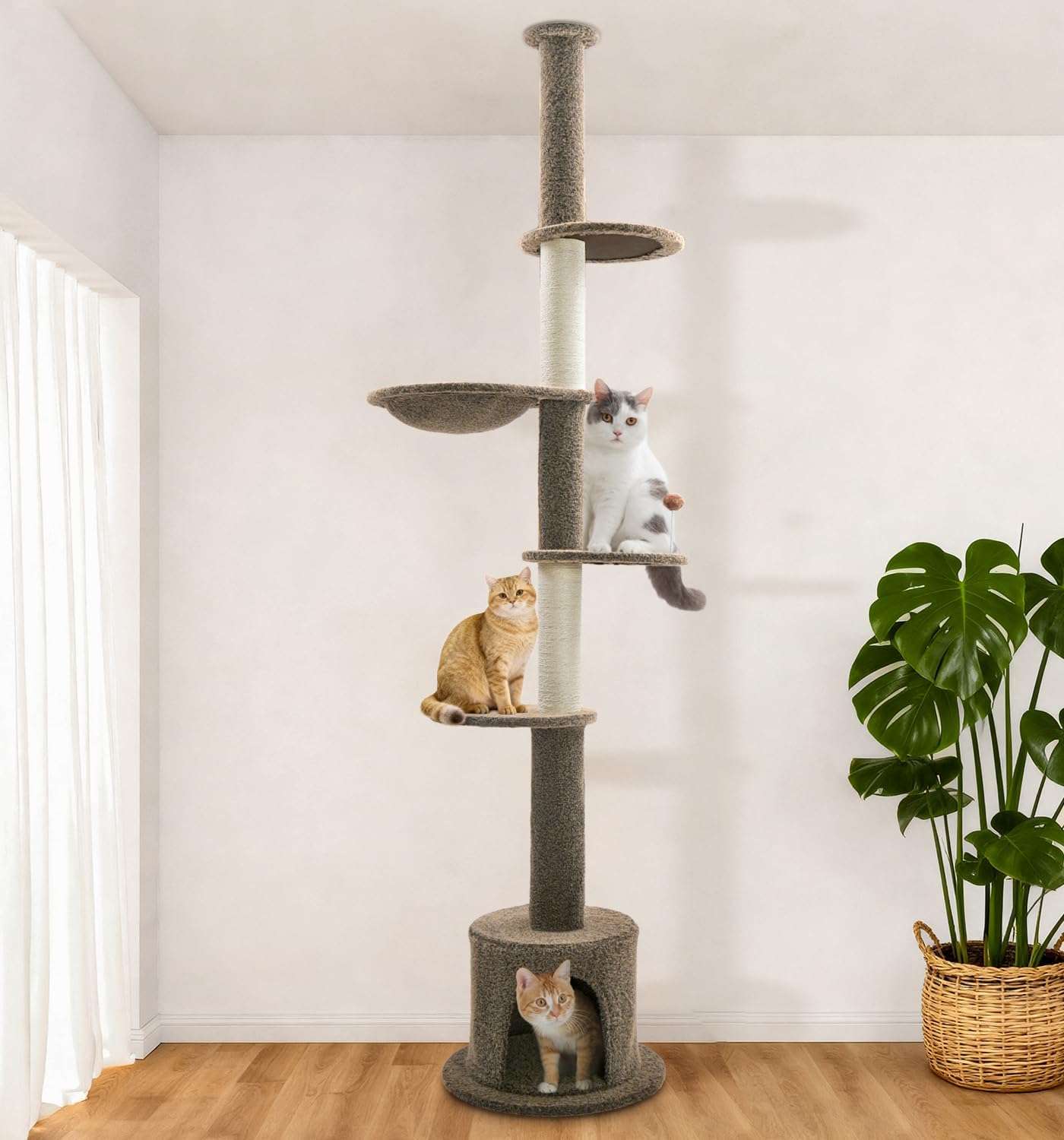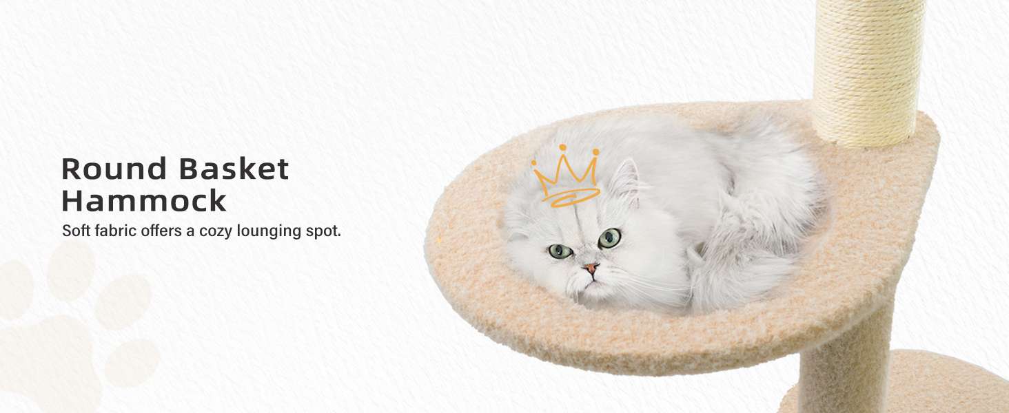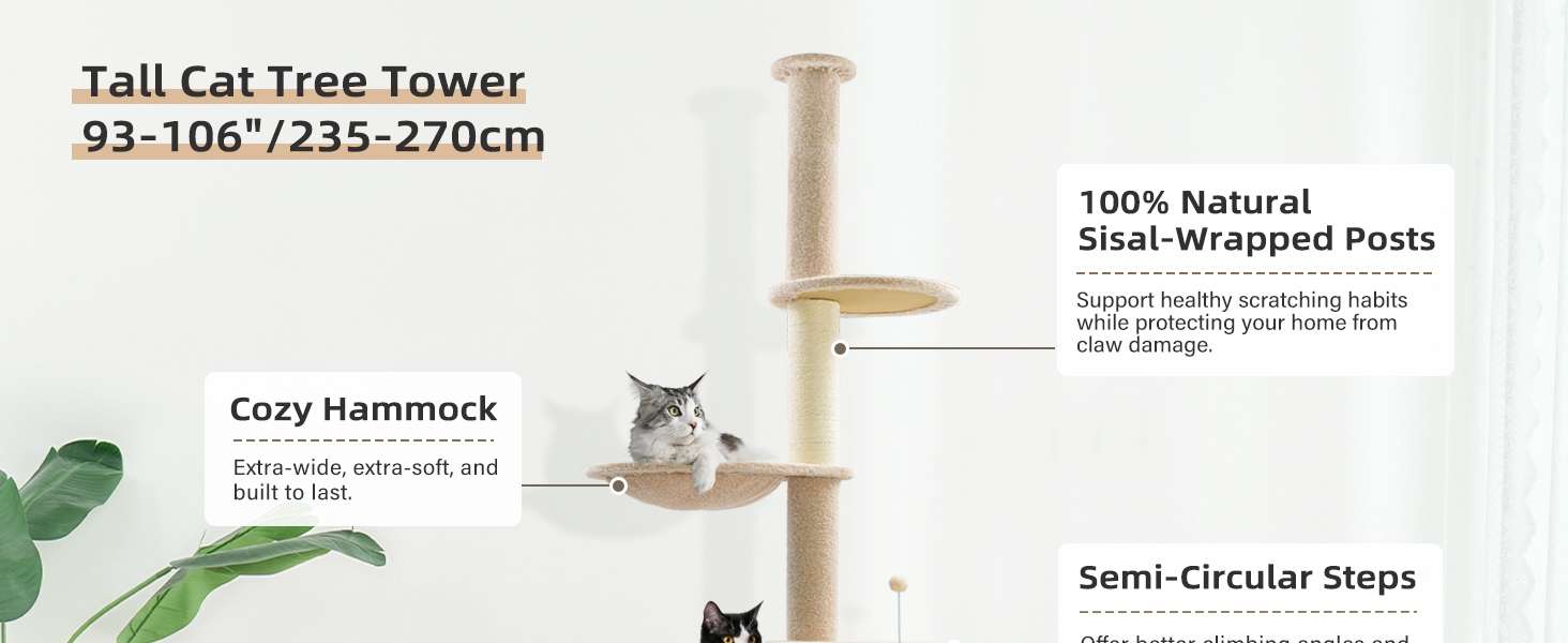Diversión Multi-Nivel y Lujo: Cinco Niveles Verticales: Diseñada con escalones gruesos y circulares, una hamaca de felpa ancha y un juguete de pelota elástica. Salud y Bienestar: Mantiene a los gatos entretenidos, reduce la ansiedad y fomenta el ejercicio saludable. Es ideal para gatos grandes y gatitos para saltar, rascar y relajarse. Materiales Cómodos: Postes envueltos en sisal natural para rascar y el resto cubierto de felpa suave y acogedora.