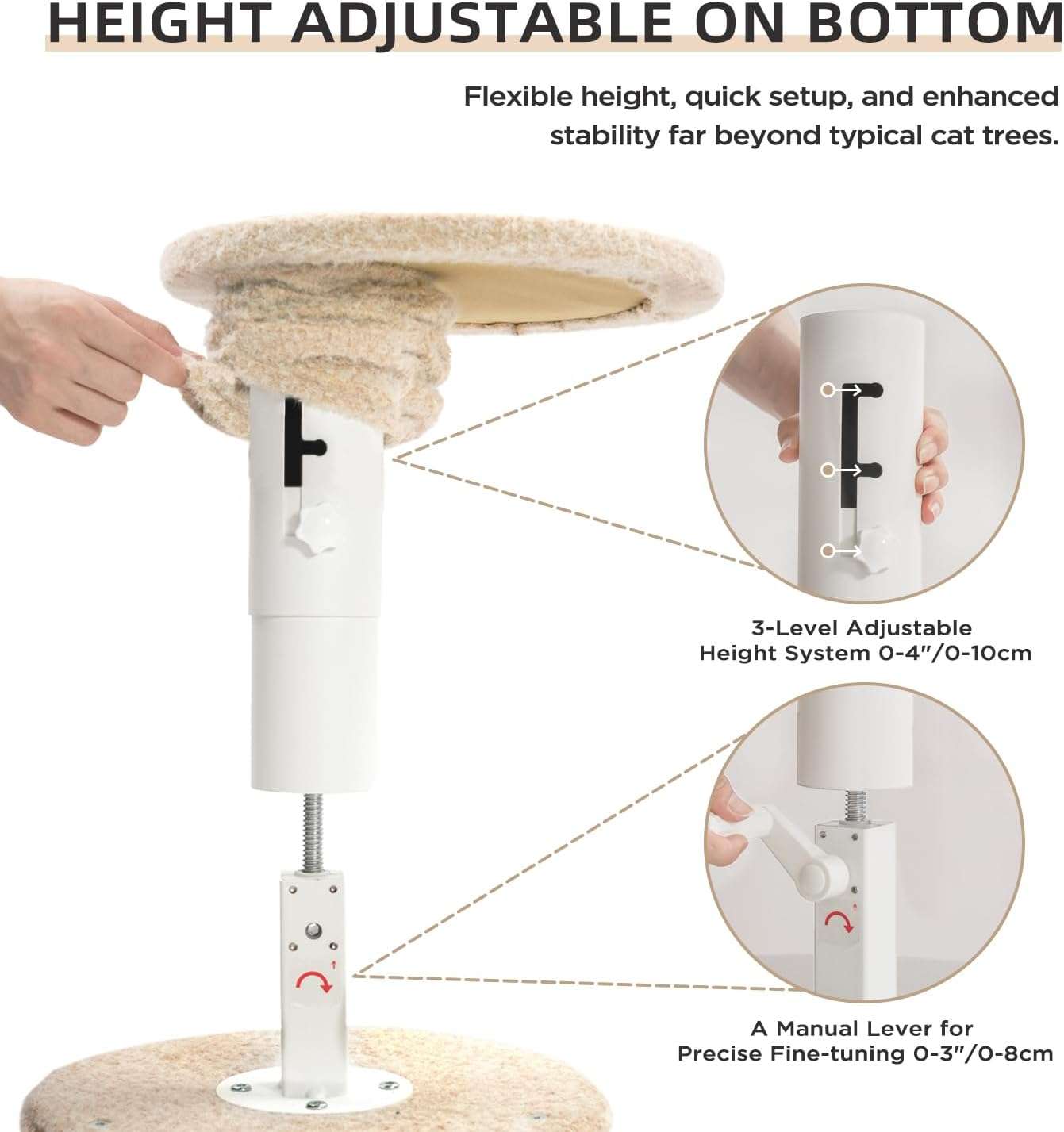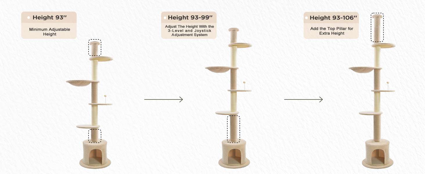 Altura Precisa y Montaje Sin Esfuerzo: Ajuste Patentado: Diseñado para adaptarse a alturas de techo desde doscientos treinta y cinco centímetros hasta doscientos setenta centímetros. Sin Perforaciones: El ajuste intuitivo estilo joystick permite una configuración sin esfuerzo, sin necesidad de taladrar ni problemas. Flexibilidad de Techo: Viene con un poste superior extraíble de siete pulgadas para una compatibilidad flexible con diferentes alturas.