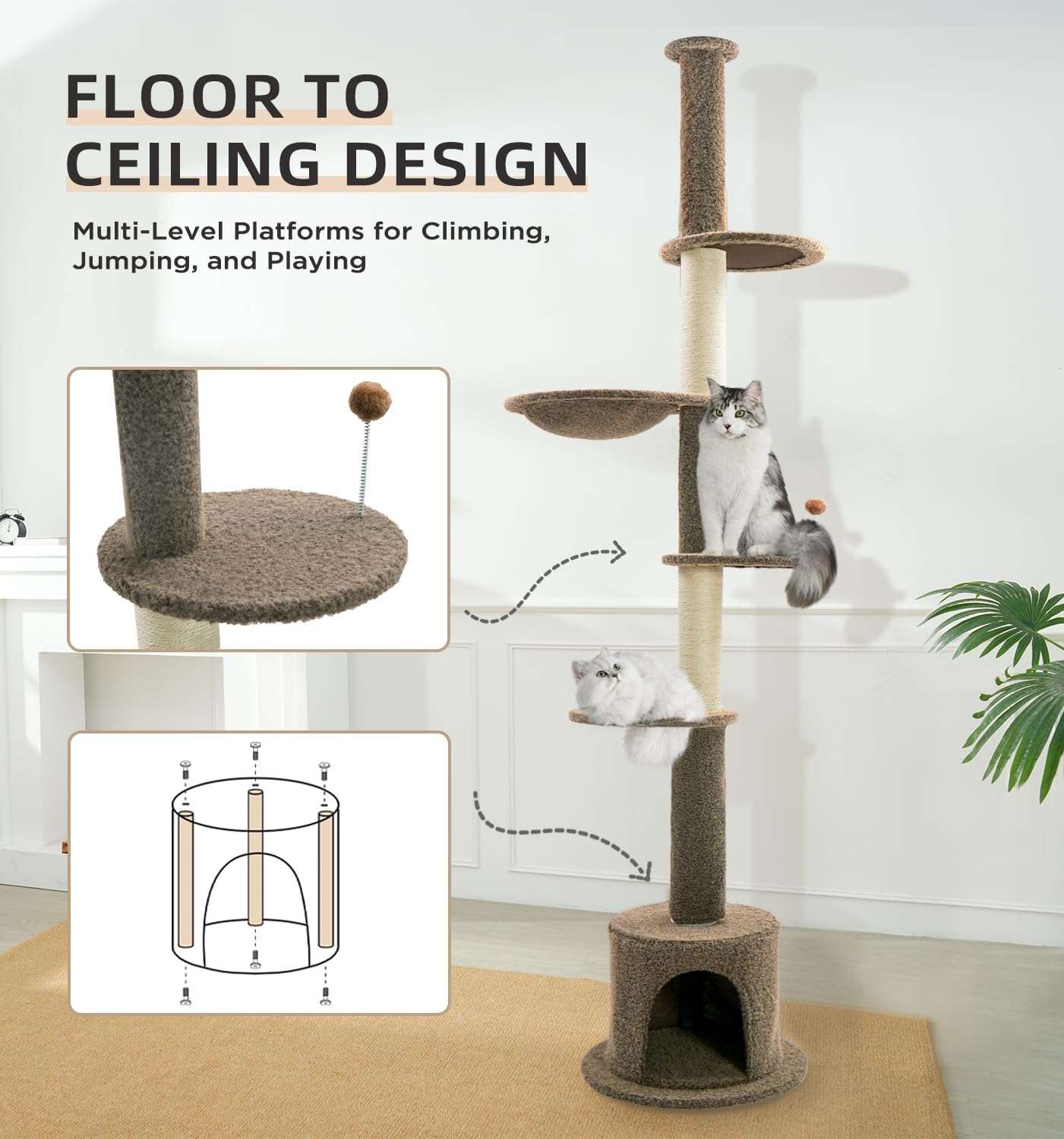 Diseño y Configuración: Colores para su Hogar: Disponible en beige, gris y marrón, este árbol combina perfectamente con cualquier decoración interior. Configuración Rápida: Todas las herramientas y un manual claro están incluidos para una configuración rápida y sin frustraciones.
