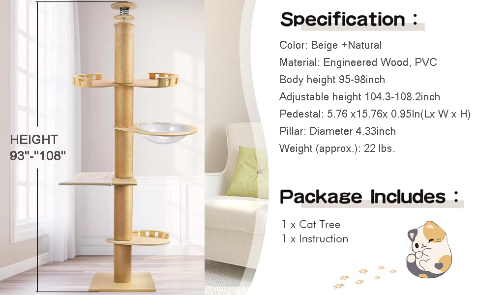 Torre Rascador Techo a Piso (275x40x40 cm) con Capsula Espacial y Postes Gruesos para Gatos Grandes.
