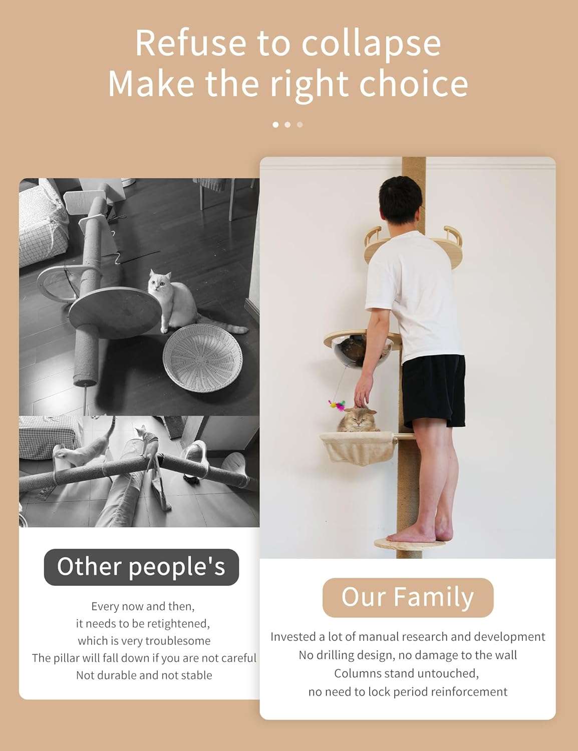 Este centro de actividades es la solucion definitiva para quienes buscan estabilidad absoluta sin perforar el techo. Con una altura impresionante de hasta 3 metros, es ideal para gatos grandes o muy activos que necesitan una estructura que no se mueva.