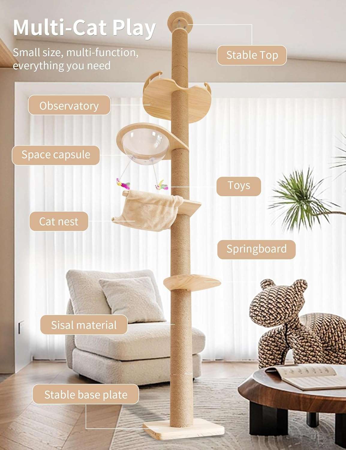Torre Rascador Techo a Piso (300x140x36 cm) con Postes Gruesos de 12 cm y Capsula Espacial para Gatos Grandes.