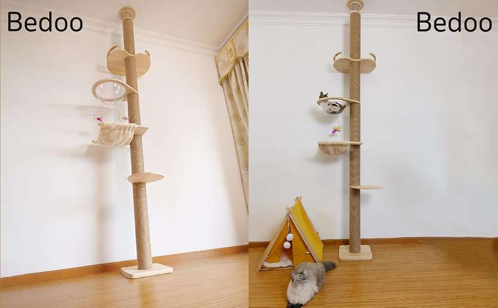 Altura Ajustable y Montaje Flexible: Incluye 8 postes de sisal de diferentes tamaños que permiten configurar la altura segun su techo (hasta 300 cm aprox). El montaje es rapido: solo apile, ajuste y apriete. Estructura de PVC, madera de pino y tablas multicapa para una durabilidad maxima.