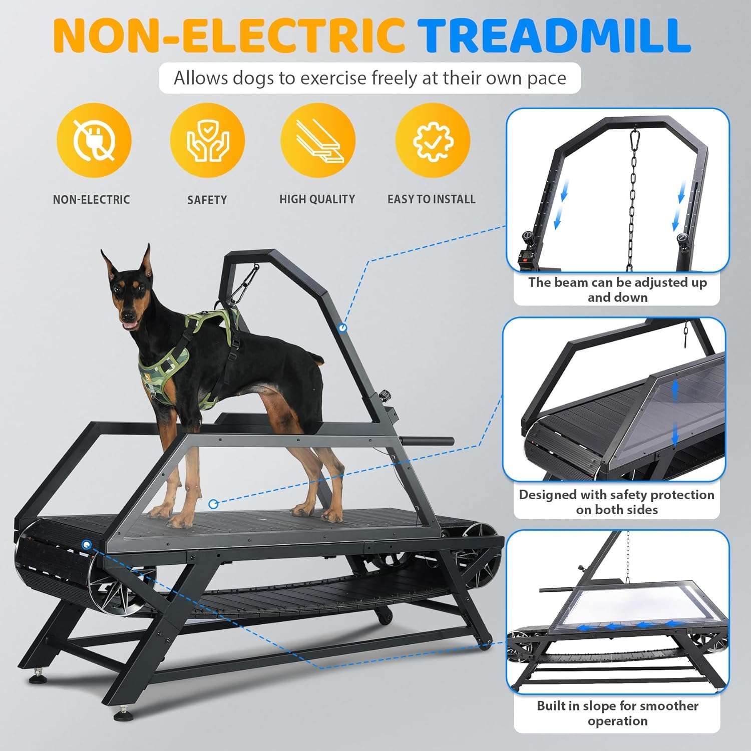 Dimensiones XL para Perros Grandes (168 cm) Muchos equipos son cortos y peligrosos. Este modelo de 168 x 56 x 137 cm ofrece una pista larga para que perros de gran tamaño puedan estirar completamente sus patas traseras al correr, evitando lesiones en la columna.